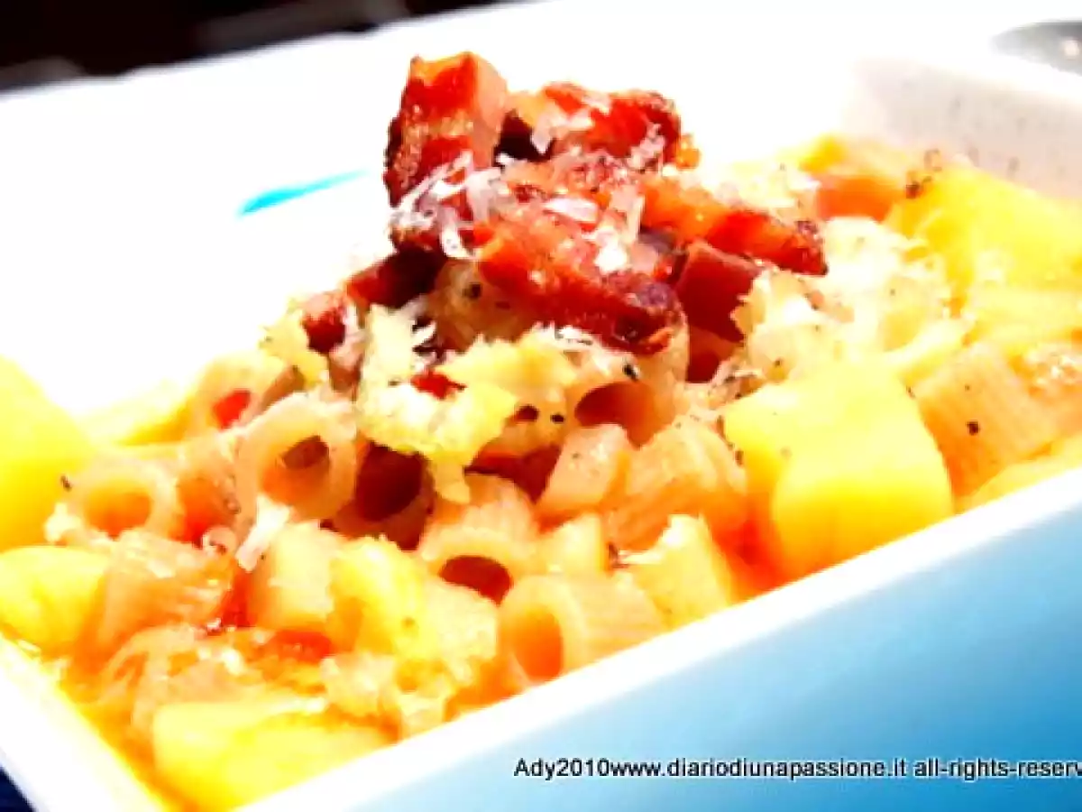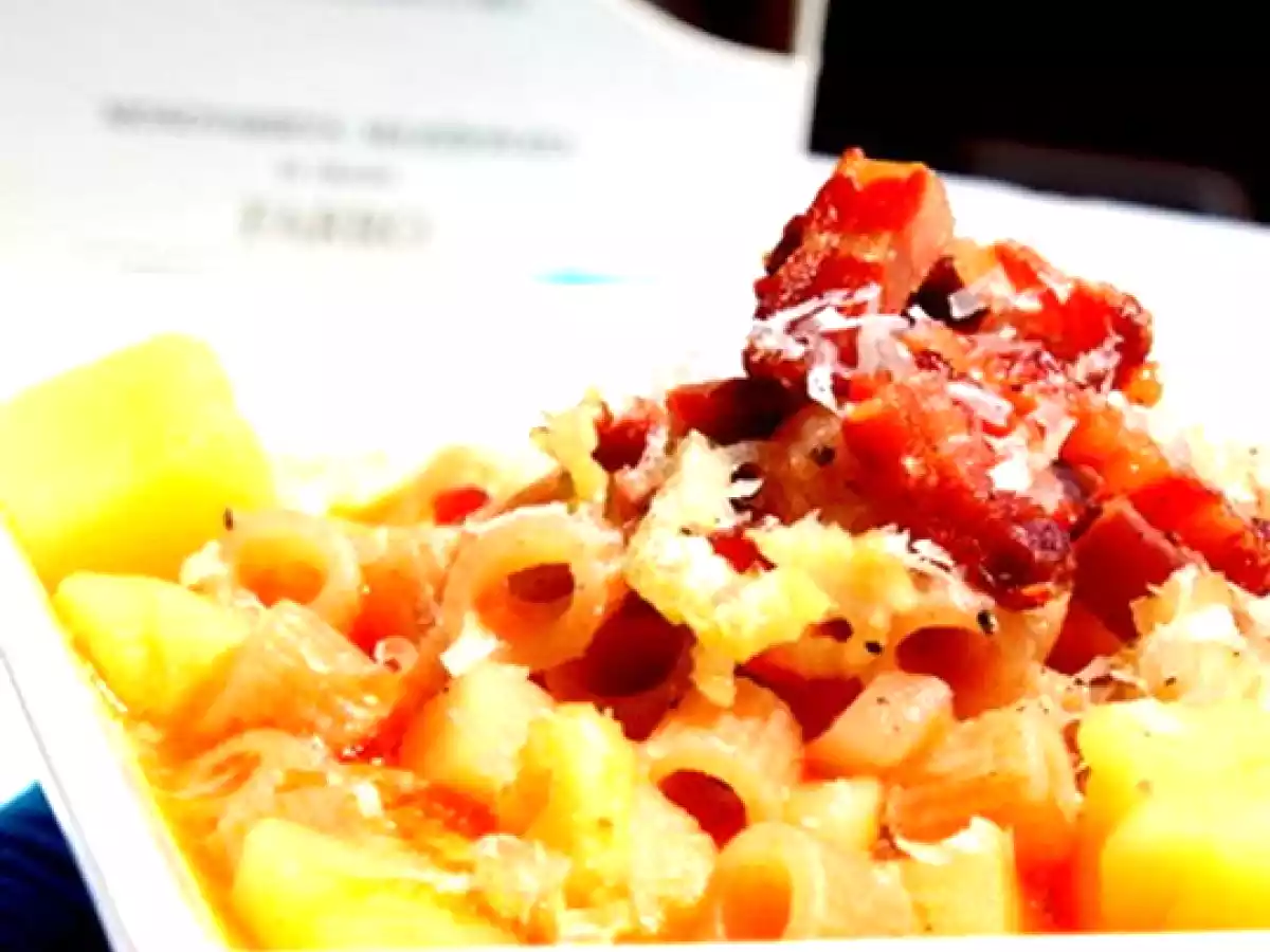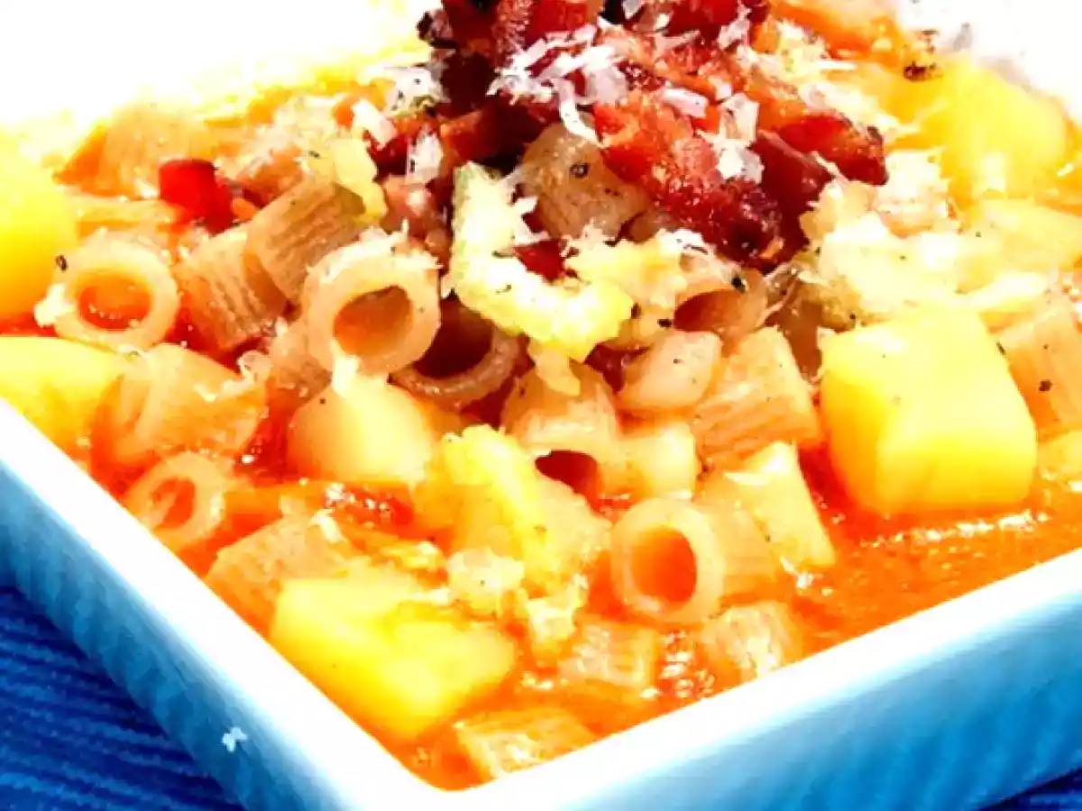 La pasta e patate della nonna PrecedenteProssimo Portata principalefacile30 min334 Kcal Invia questa ricetta ad un amico Stampa la ricetta Contatta l'autore della Ricetta Pubblica la foto di questa ricetta Ingredienti 4 240 g di ditalini Felicetti al farro 2 patate grandi una costa di sedano una carota una cipolla piccola un cucchiaino di concentrato di pomodoro brodo vegetale 2 cucchiai di olio evo 50 g di pancetta affumicata tagliata a listarelle 50 g di parmigiano grattugiato una costa piccola di sedano tagliata alla julienne e messa a bagno in acqua ghiacciata sale e pepe nero