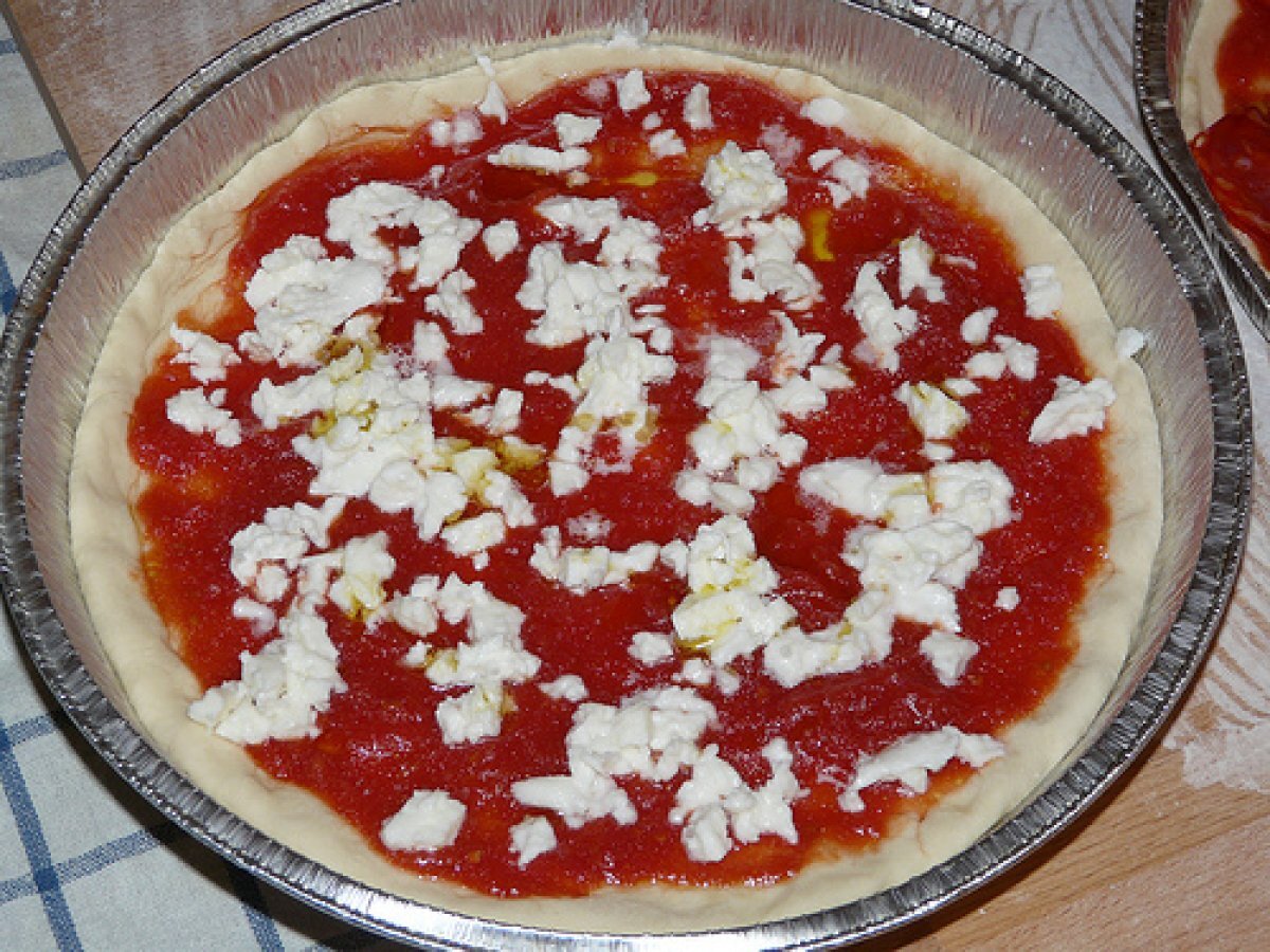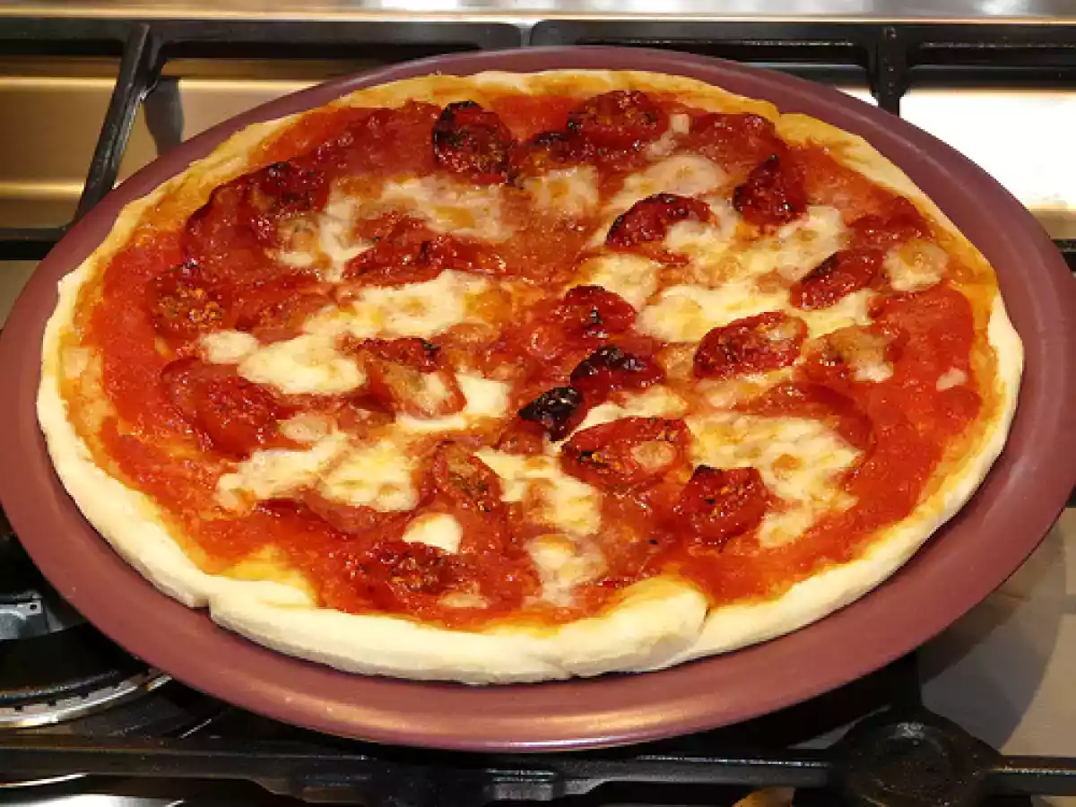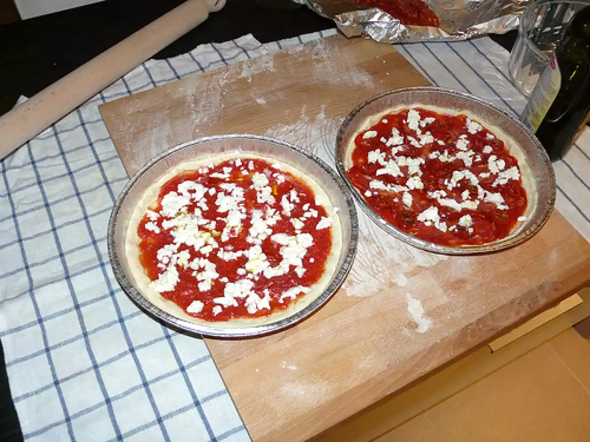 La pizza salame piccante e pomodorini secchi (?ma anche una margherita) PrecedenteProssimo Portata principalefacile1 h 20 m Invia questa ricetta ad un amico Stampa la ricetta Contatta l'autore della Ricetta Pubblica la foto di questa ricetta Una ricetta che permette di avere tipo di gusto di pizza! Ingredienti 6 500 g di farina 13 g di lievito di birra (sciolto in acqua tiepida) 6 g sale 2 cucchiai d’olio acqua, quanta ne basta per impastare passata di pomodoro salata e amalgamata con 2 cucchiai di olio extravergine di oliva mozzarella a fettine o dadini foglie di basilico passata di pomodoro salata e amalgamata con 2 cucchiai di olio extravergine di oliva salame piccante a fette mozzarella a dadini pomodorini secchi
