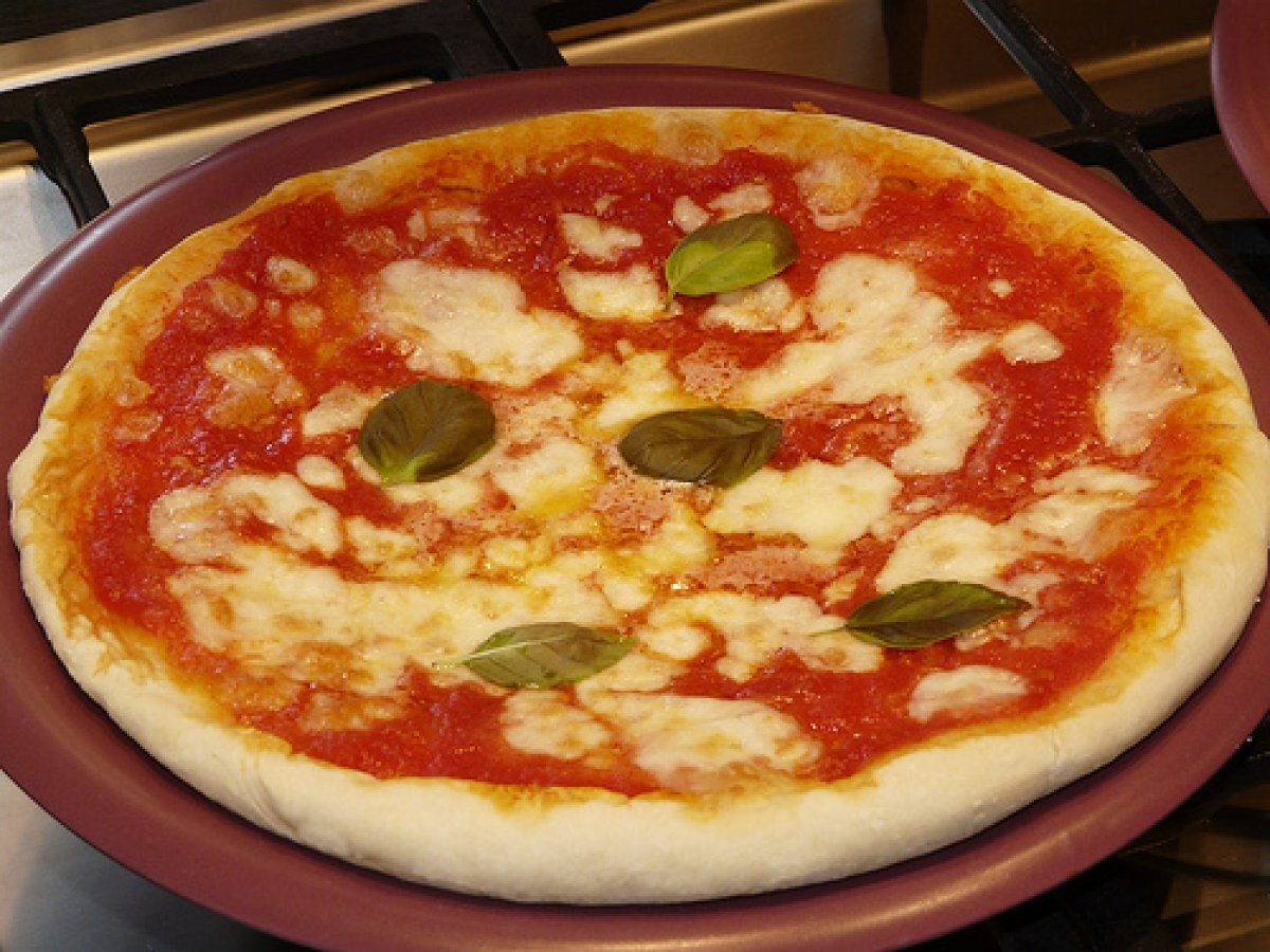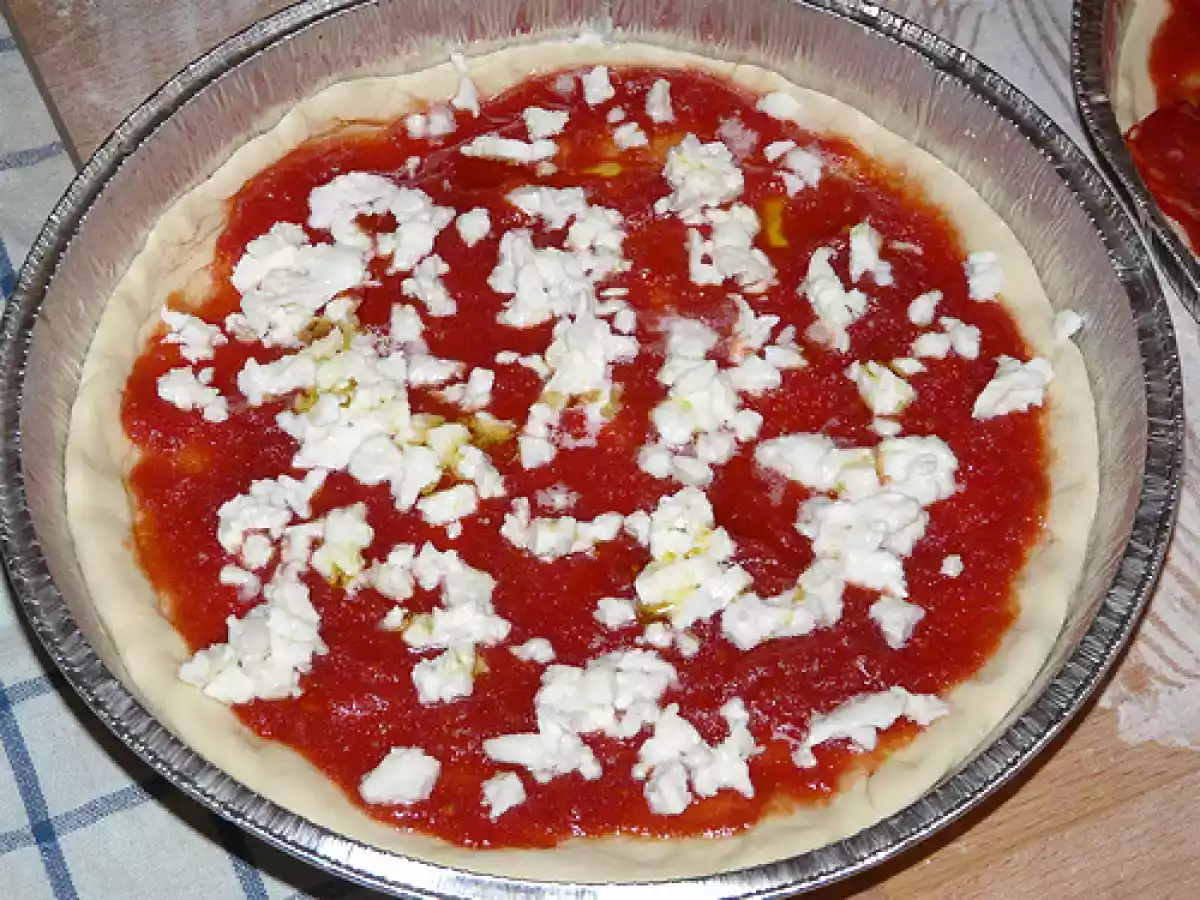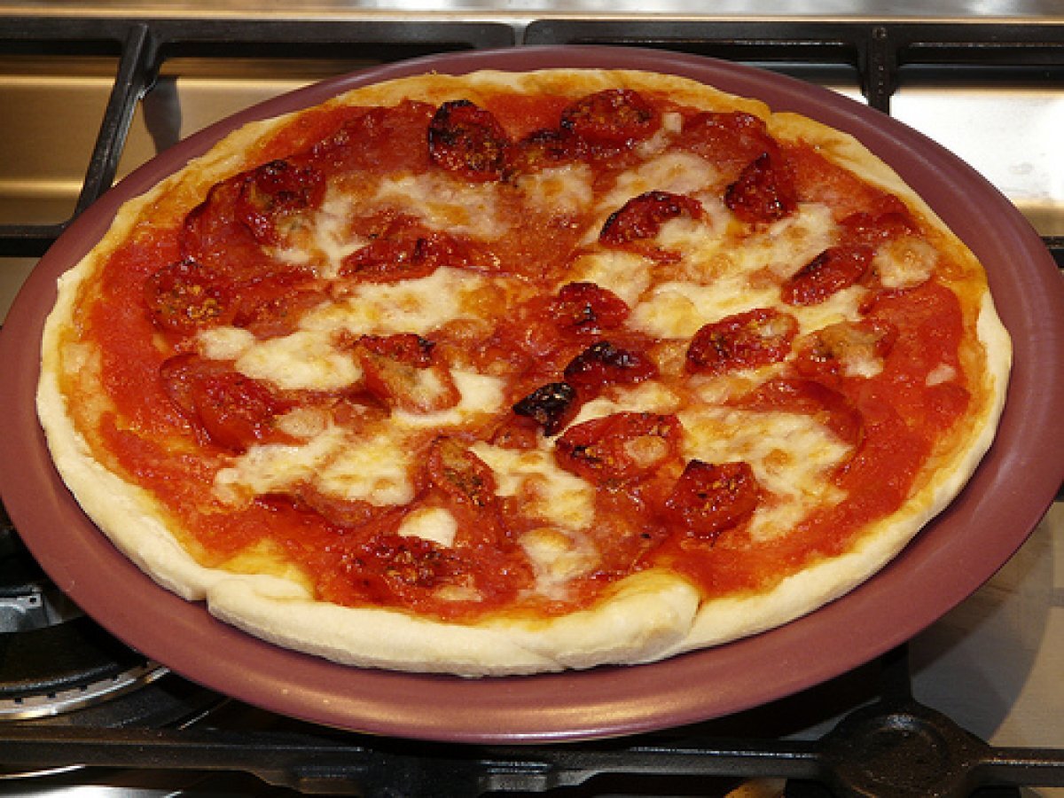 La pizza salame piccante e pomodorini secchi (?ma anche una margherita) PrecedenteProssimo Portata principalefacile1 h 20 m Invia questa ricetta ad un amico Stampa la ricetta Contatta l'autore della Ricetta Pubblica la foto di questa ricetta Una ricetta che permette di avere tipo di gusto di pizza! Ingredienti 6 500 g di farina 13 g di lievito di birra (sciolto in acqua tiepida) 6 g sale 2 cucchiai d’olio acqua, quanta ne basta per impastare passata di pomodoro salata e amalgamata con 2 cucchiai di olio extravergine di oliva mozzarella a fettine o dadini foglie di basilico passata di pomodoro salata e amalgamata con 2 cucchiai di olio extravergine di oliva salame piccante a fette mozzarella a dadini pomodorini secchi
