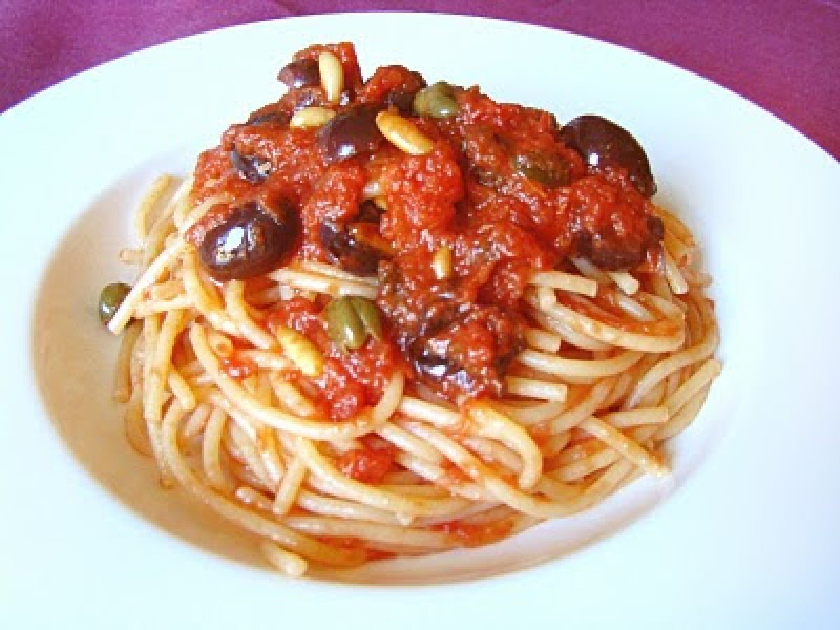 - Soffriggere l'aglio e il peperoncino nell'olio, quindi tostare i pinoli, aggiungere uvetta, capperi e olive, soffriggere fino a che l'uvetta non si è gonfiata, quindi aggiungere il pomodoro.