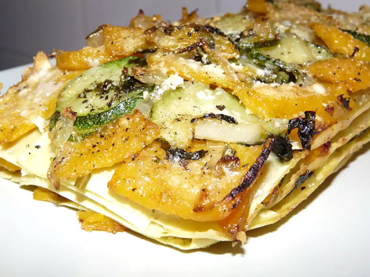 Lasagna alla zucca (e zucchina, e pecorino) vota adesso Portata principalefacile45 min Invia questa ricetta ad un amico Stampa la ricetta Contatta l'autore della Ricetta Pubblica la foto di questa ricetta Ingredienti 2 lasagne fresche, di quelle che non necessitano di essere sbollentate e che in 15 minuti sono cotte. 200 grammi di polpa di zucca, affettata fine 200 grammi di zucchina, affettata a rondelle sottili mezza cipolla, tritata a dadini un dente d’aglio, tritato finemente un mazzetto di prezzemolo, sminuzzato un bicchiere di vino bianco mezzo etto di pecorino grattugiato burro, una noce