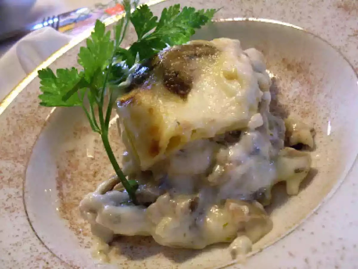 Lasagna golosissima ai funghi con taleggio e patate. PrecedenteProssimo Portata principalefacile40 min Invia questa ricetta ad un amico Stampa la ricetta Contatta l'autore della Ricetta Pubblica la foto di questa ricetta Ingredienti 2 funghi porcini funghi champignon aglio prezzemolo burro taleggio purè di patate grana grattugiato lasagna fresca besciamella fluida