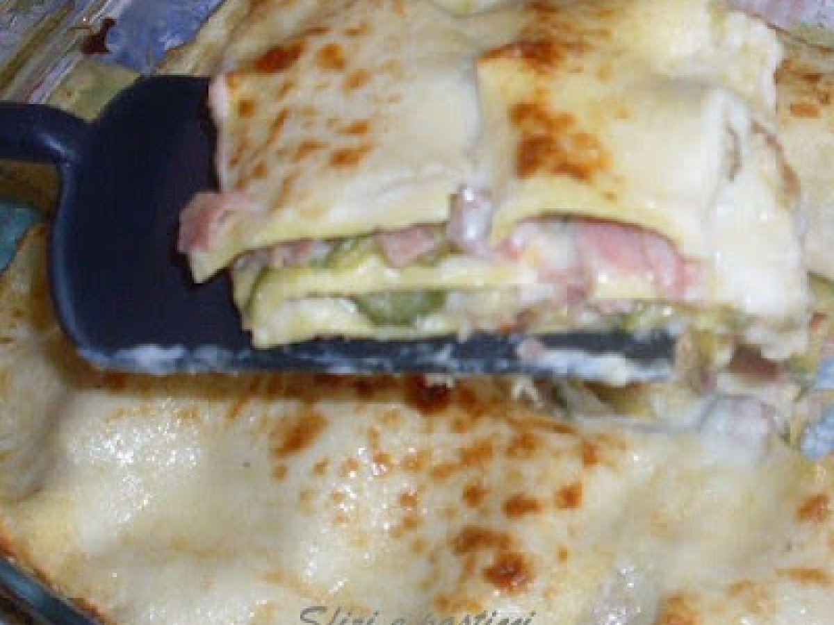 Lasagne al prosciutto cotto e zucchine Portata principalefacile50 min Invia questa ricetta ad un amico Stampa la ricetta Contatta l'autore della Ricetta Pubblica la foto di questa ricetta Ingredienti 4 250 g di pasta per lasagne fresca 200 g di prosciutto cotto 5 zucchine lunghe 1 cipolla 100 g di parmigiano grattugiato 2 cucchiai di olio extravergine d'oliva Besciamella fatta con 500 g di latte 40 g di farina 40 g di burro e 1 grattugiata di noce moscata