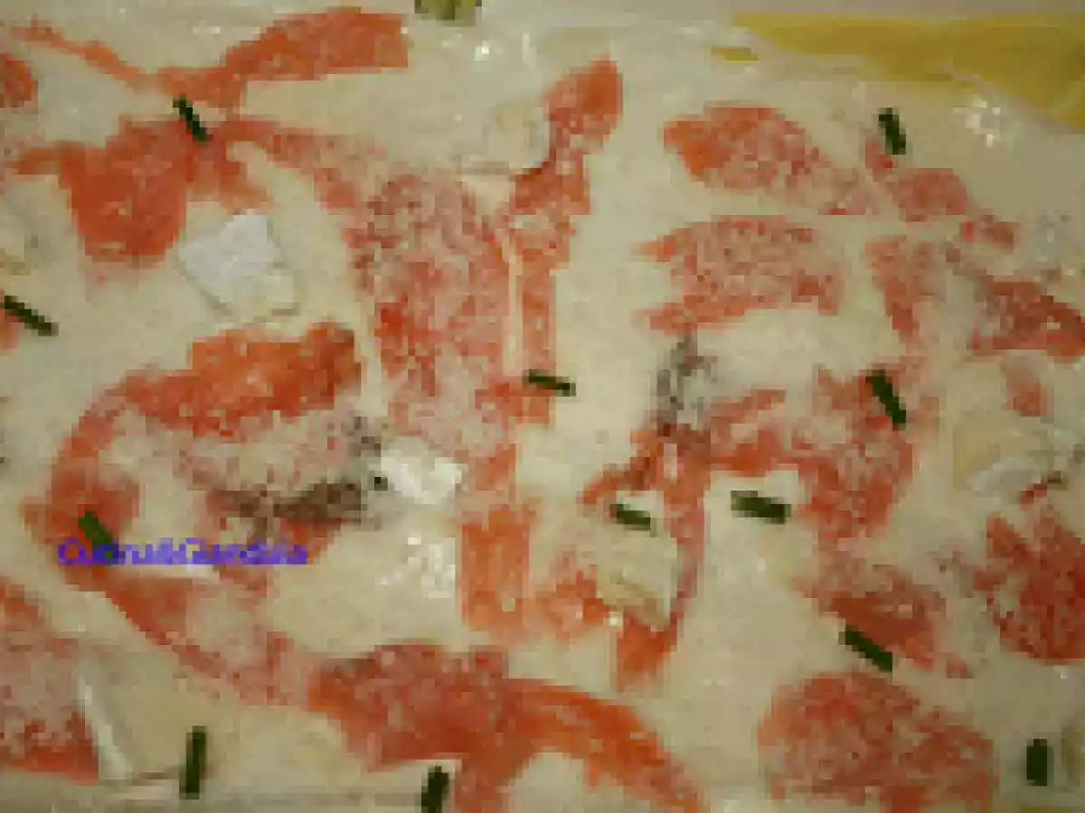 Lasagne al salmone, brie ed erba cipollina PrecedenteProssimo Portata principalefacile50 min487 Kcal Invia questa ricetta ad un amico Stampa la ricetta Contatta l'autore della Ricetta Pubblica la foto di questa ricetta Ingredienti 4 300 g salmone affumicato 70 - 80 g brie 2 fili d'erba cipollina 250 g lasagne fresche parmigiano q.b. 1 lt besciamella preparata con: 80 g burro 80 g farina 1 lt latte sale noce moscata