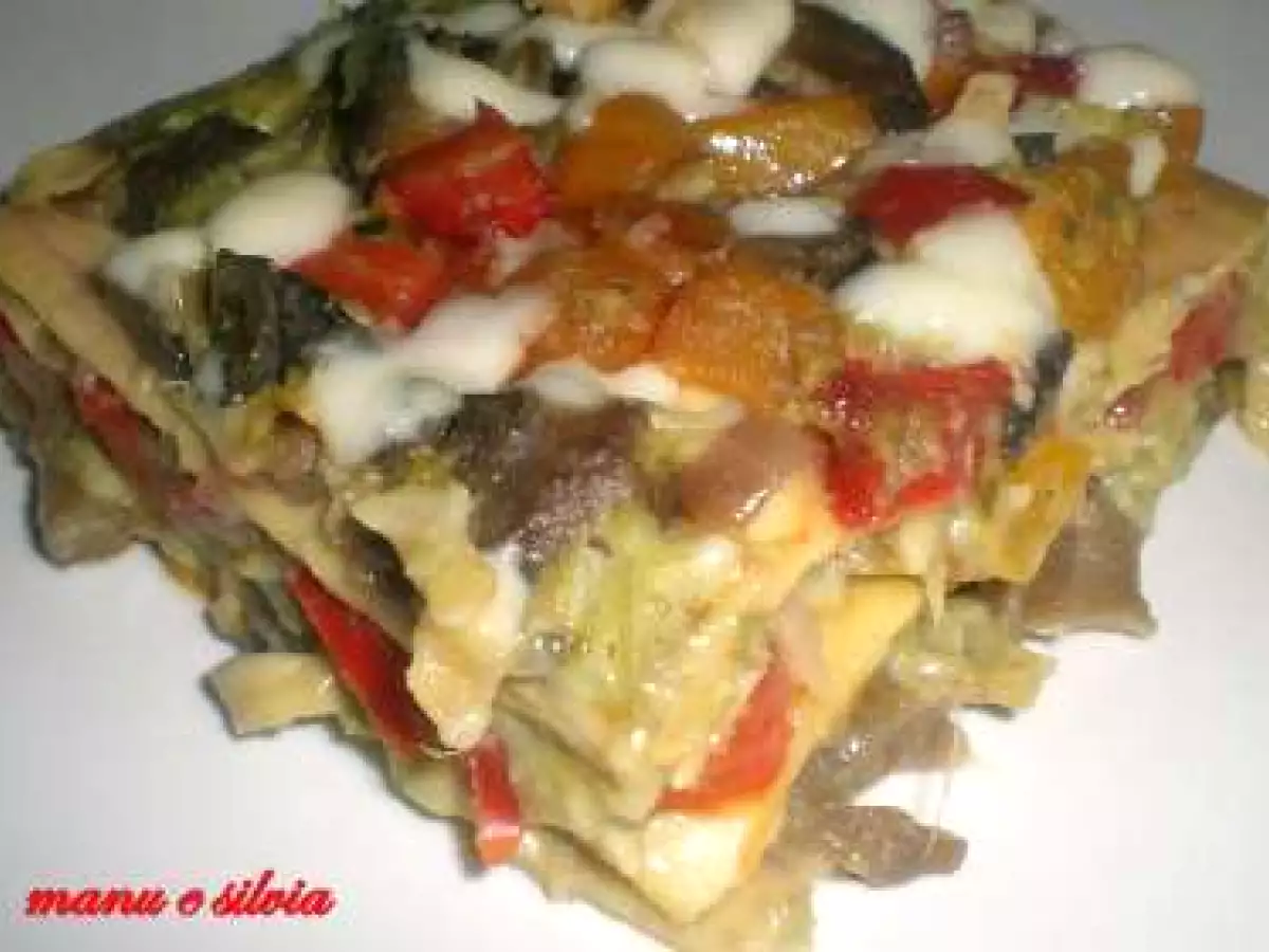 Lasagne alle verdure dell'orto Portata principaleDifficile1 h 55 m Invia questa ricetta ad un amico Stampa la ricetta Contatta l'autore della Ricetta Pubblica la foto di questa ricetta Ingredienti 6 9 sfoglie di pasta alluovo per lasagne 2 peperino (rosso e giallo) 2 melanzane formaggio morbido cipolla bianca aglio in polvere peperoncino vino bianco e rosso basilico fresco sale, pepe bianco Per il pesto di fagiolini: 200g fagiolini verdi olio evo sale Per la besciamella: 37g farina 00 37g margarina 370ml latte noce moscata sale, pepe bianco
