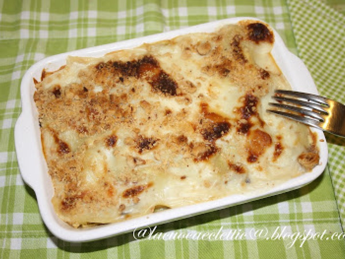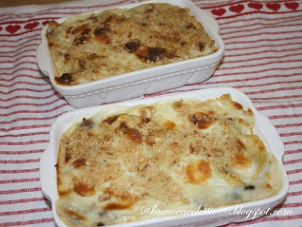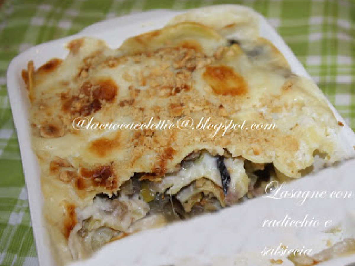 Lasagne con radicchio e salsiccia PrecedenteProssimo Portata principalefacile1 ora950 Kcal Invia questa ricetta ad un amico Stampa la ricetta Contatta l'autore della Ricetta Pubblica la foto di questa ricetta Ingredienti 3 per l'impasto: 160 g di farina 00 40 g di grano duro 2 uova per il ripieno: 500 g di radicchio tardivo 1 salsiccia 1 porro 80 g di scamorza affumicata 60 g di nocciole parmigiano reggiano olio extravergine di oliva sale per la besciamella: 40 g di burro 40 g di farina 1/2 l di latte noce moscata sale
