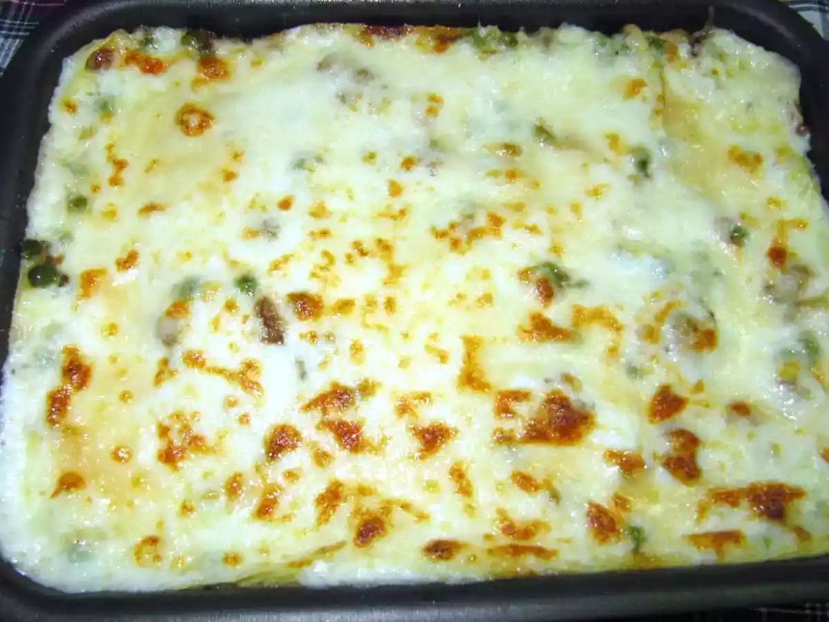 Lasagne con speck e porcini vota adesso PrecedenteProssimo Portata principalemedia50 min Invia questa ricetta ad un amico Stampa la ricetta Contatta l'autore della Ricetta Pubblica la foto di questa ricetta Ingredienti 6 10-12 fogli di pasta per lasagne 1 cipolla 1 litro di besciamella 30 gr di porcini secchi 150 gr di piselli surgelati 100 gr di speck affettato sottile 1 spicchio d'aglio brodo vegetale parmigiano grattugiato olio extravergine d'oliva sale e pepe q.b.