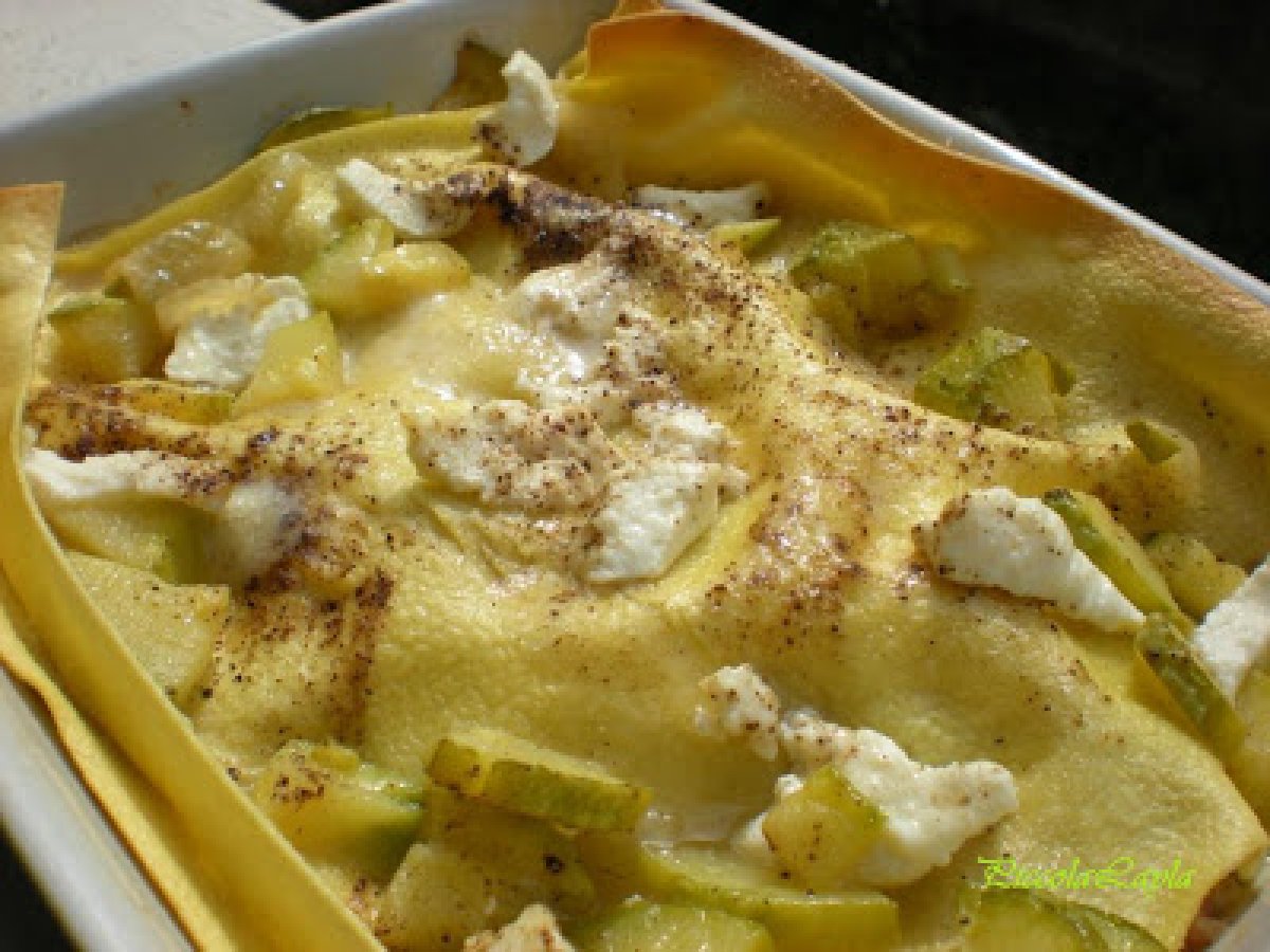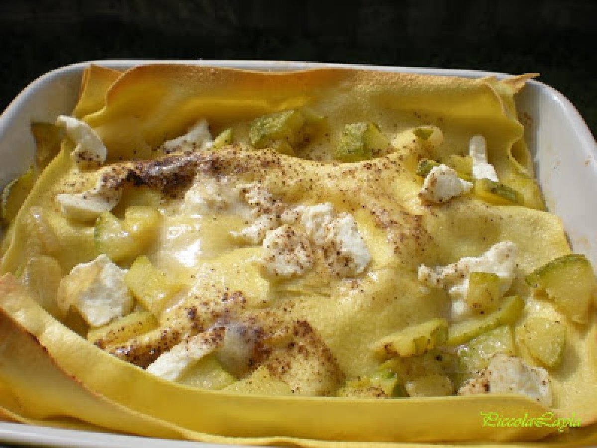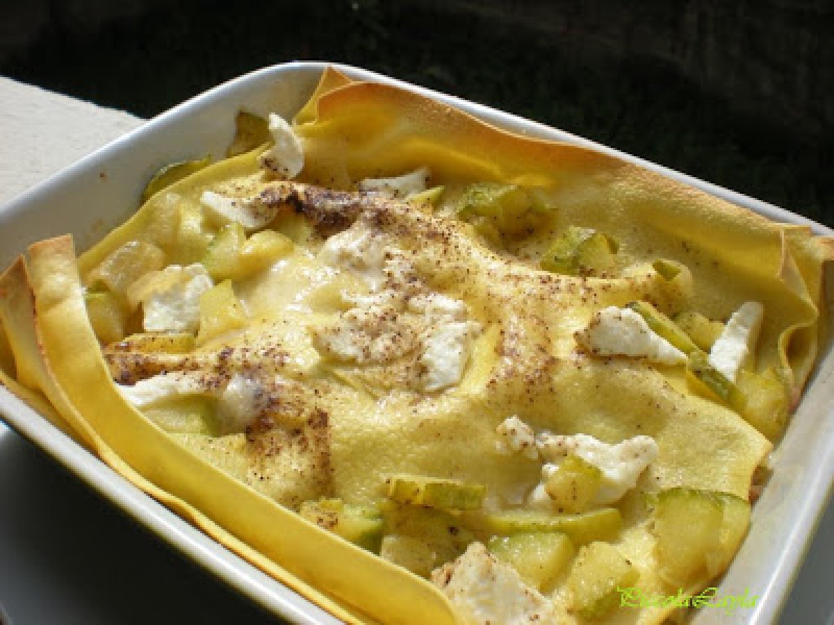Lasagne con zucchine e ricotta fresca PrecedenteProssimo Portata principalefacile55 min542 Kcal Invia questa ricetta ad un amico Stampa la ricetta Contatta l'autore della Ricetta Pubblica la foto di questa ricetta Ingredienti 2 3 fogli di lasagne fresche all'uovo 1 zucchina 6 cucchiai di ricotta 3 cucchiai di formaggio grattug 2 fetta di prosciutto cotto 50 g di dadini di formaggio filante 1/2 di cipolla bianca 1/2 bicchiere di vino 1 cucchiaino di dado vegetale olio extravergine di oliva pepe nero sale Costo stimato: 4.94Euros€ (2.47€/Porzioni)