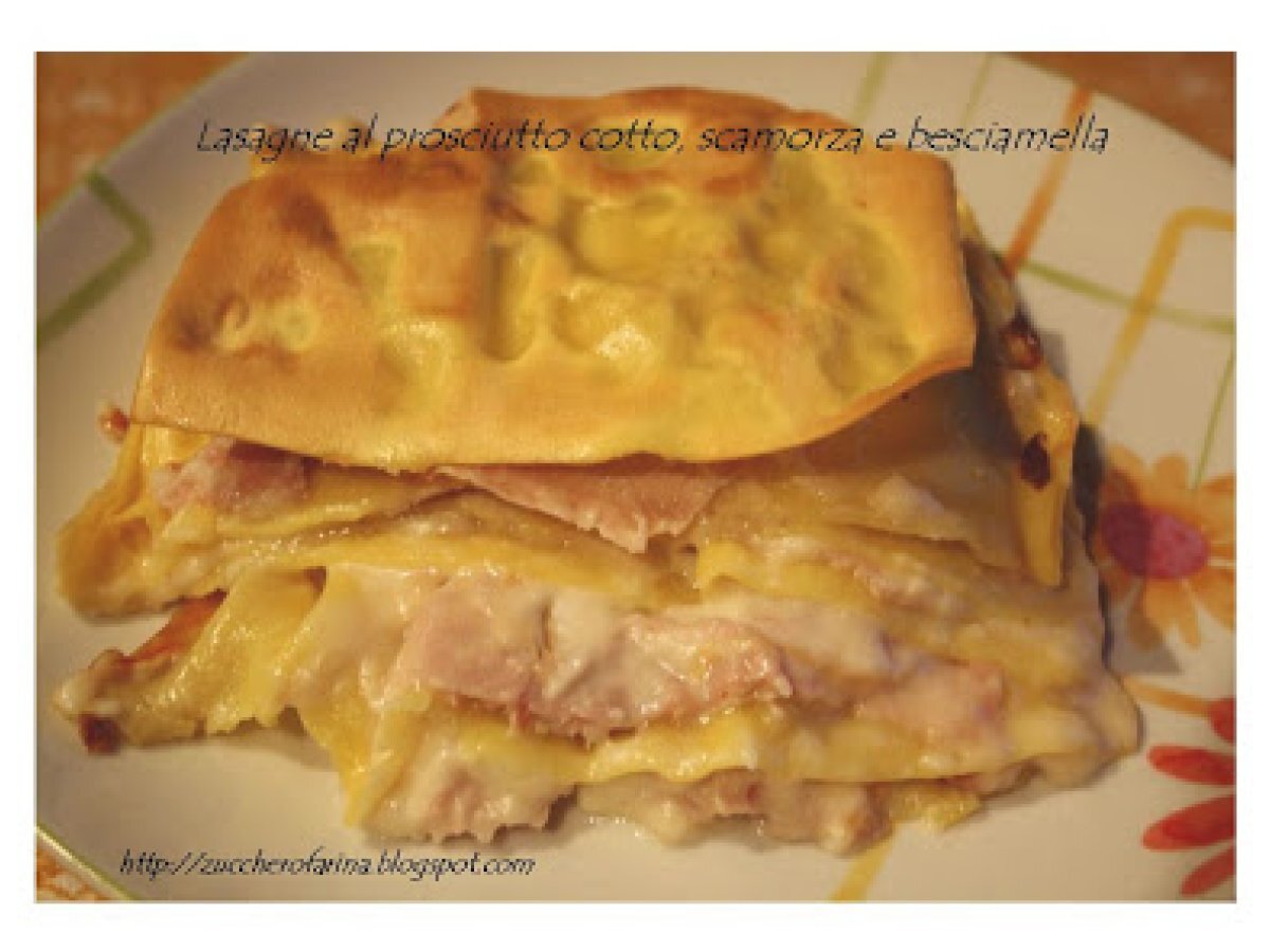Lasagne prosciutto cotto, scamorza e besciamella Portata principalefacile1 h 10 m498 Kcal Invia questa ricetta ad un amico Stampa la ricetta Contatta l'autore della Ricetta Pubblica la foto di questa ricetta Ingredienti 4 1 confezione di pasta fresca stesa per lasagne 250 g di prosciutto cotto 200 g di scamorza affumicata Per la besciamella: 500 ml di latte 50 g di burro 1 cucchiaio di farina Noce moscata Costo stimato: 6.86Euros€ (1.72€/Porzioni)