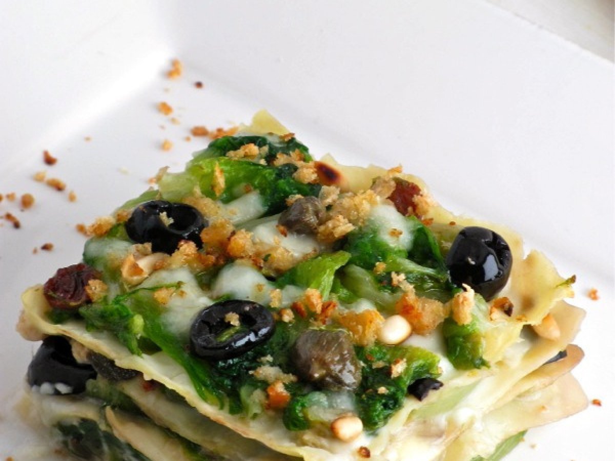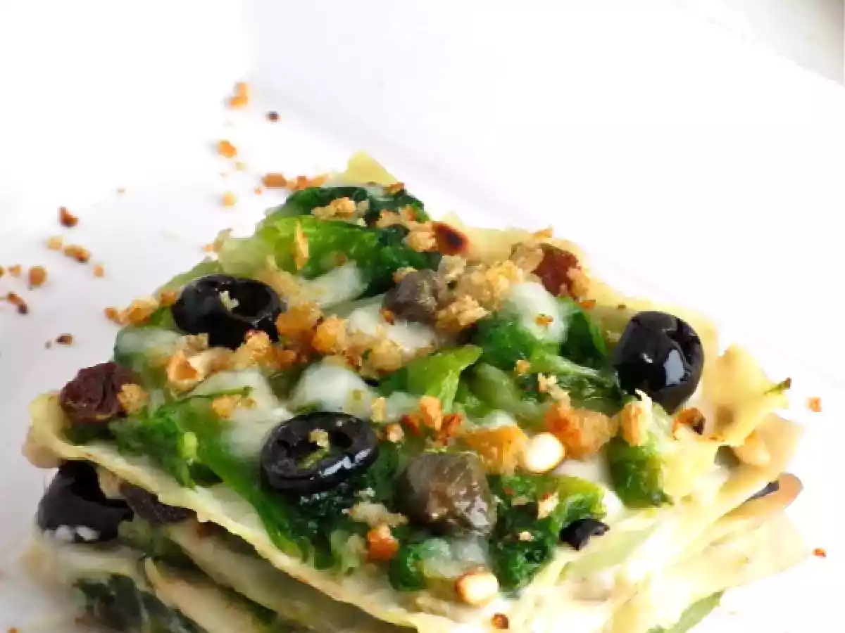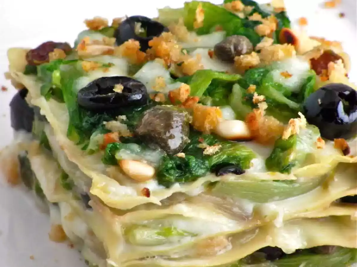 Lasagne scarola e bufala PrecedenteProssimo Portata principalemedia2 h 20 m Invia questa ricetta ad un amico Stampa la ricetta Contatta l'autore della Ricetta Pubblica la foto di questa ricetta Volete provare delle lasagne eccezionali? Seguite la ricetta spiegata passo a passo! Ingredienti 4 1 cespo di scarola 250 gr. di mozzarella di bufala 100 gr. di olive nere 30 gr. di pinoli 20 gr. di uva passa 20 gr. di capperi sotto sale 2 filetti di acciuga 2 fette di pane casereccio olio EVO q.b. sale q.b. Per la besciamella: 500 ml di latte 40 gr. di farina 30 gr. di olio EVO sale q.b. Per la pasta all'uovo: 200 gr. di farina 00 2 uova 1 cucchiaino di olio EVO 2 gr. di sale