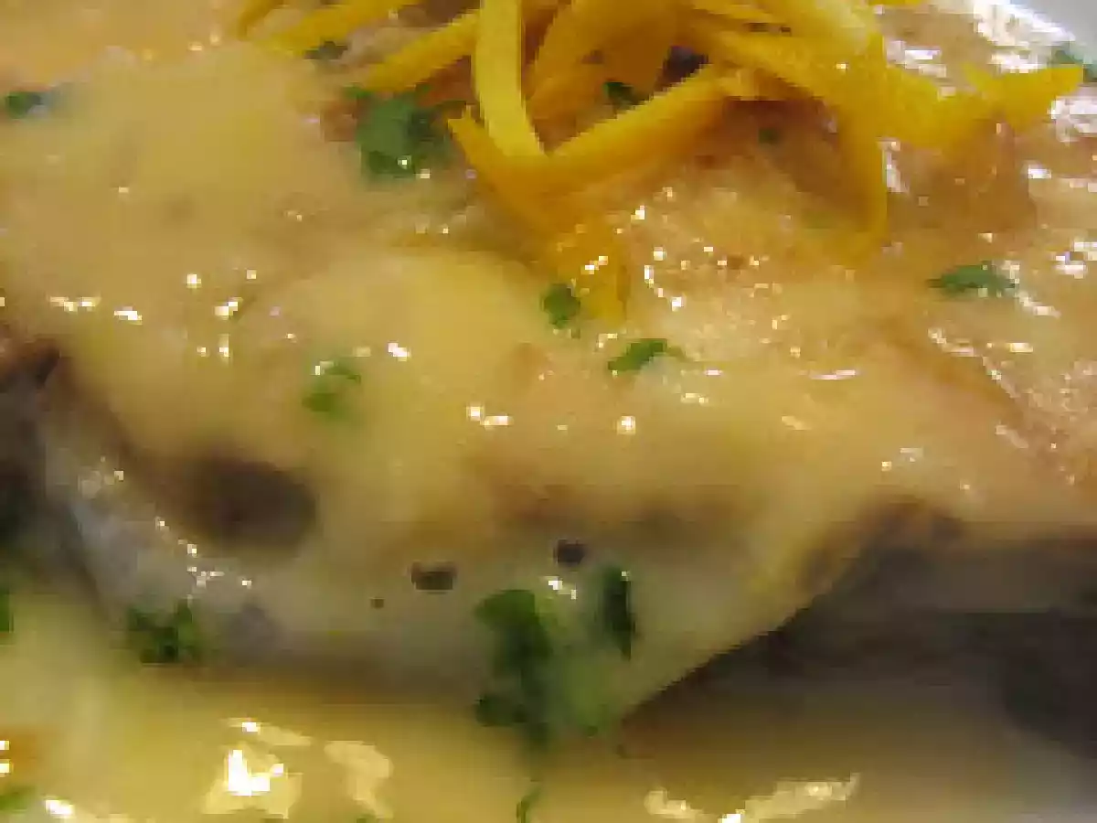 Latitanza.....scaloppina all'arancia.....di dentice PrecedenteProssimo Portata principalefacile45 min Invia questa ricetta ad un amico Stampa la ricetta Contatta l'autore della Ricetta Pubblica la foto di questa ricetta Ingredienti 4 2 tranci di dentice poco burro 1 bicchiere di vino bianco secco sale q.b. pepe q.b. farina per impanare i tranci prezzemolo e maggiorana tritati per la salsa buccia e succo di una arancia 1 cucchiaino di maizena 50 g di acqua +qualche cucchiaio sale q.b.