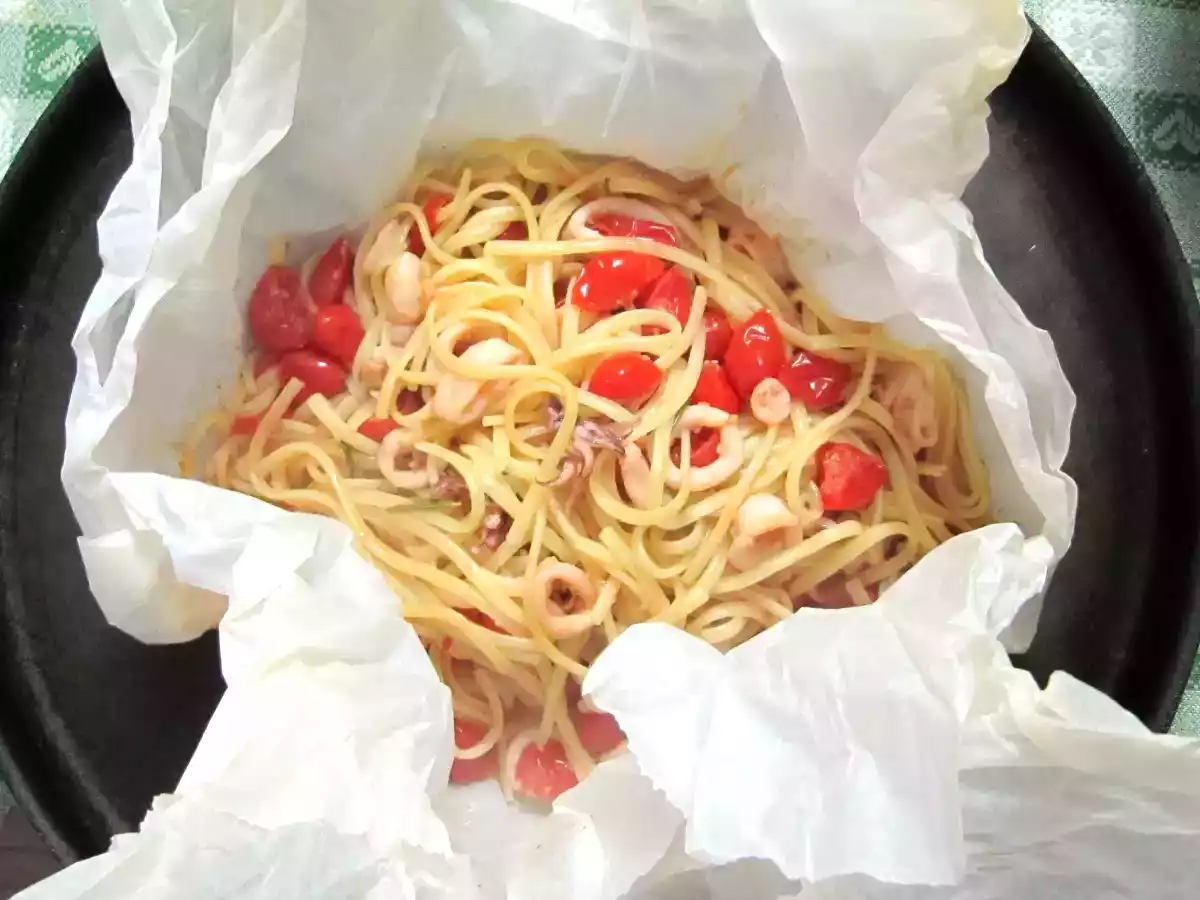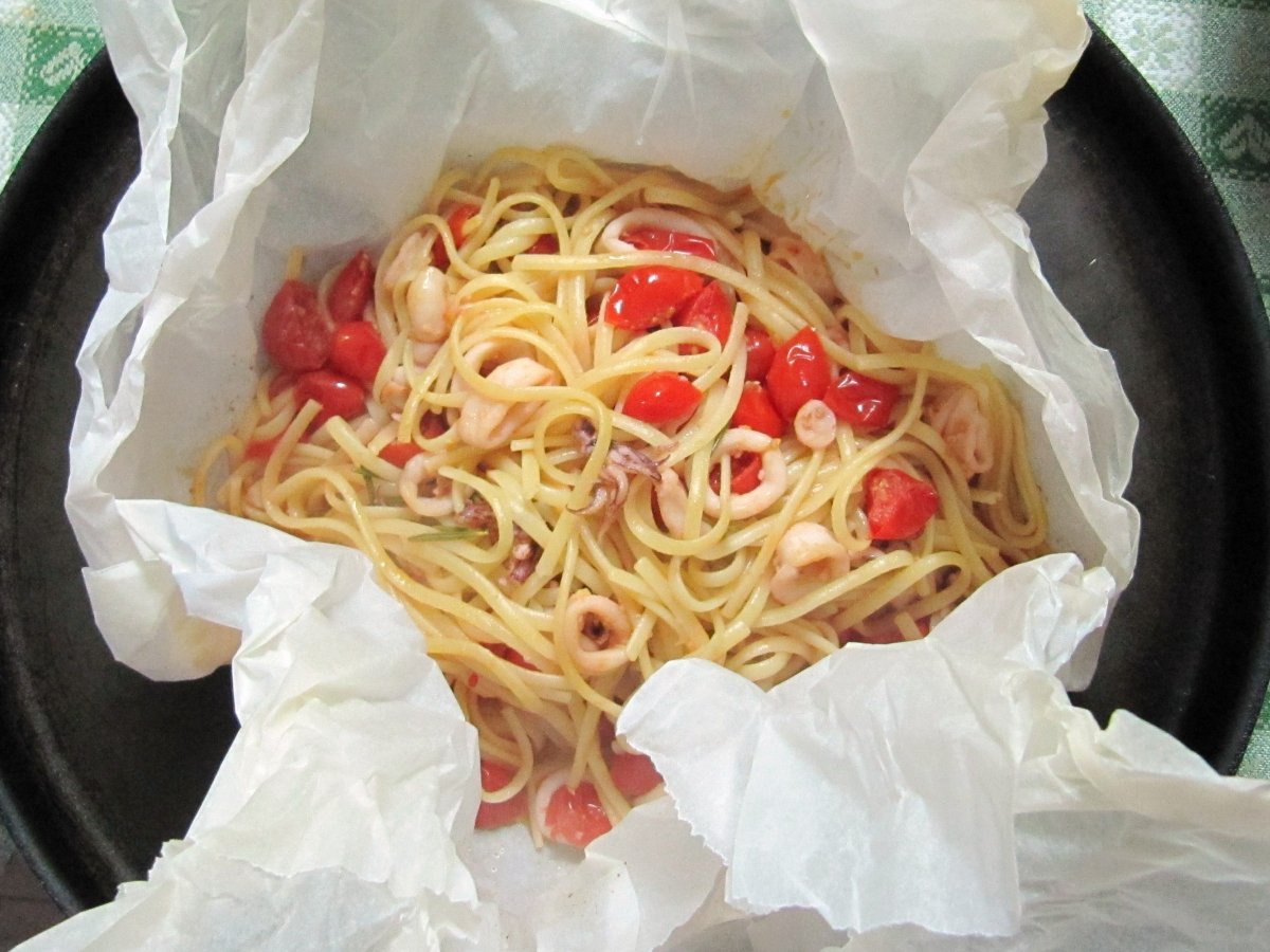 Un primo di mare al cartoccio con calamari e pomodori datterini, al profumo di rosmarino