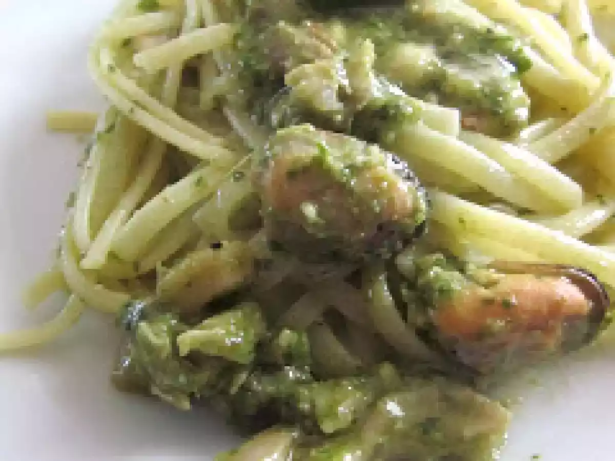 Linguine al pesto verde e frutti di mare Portata principalefacile55 min191 Kcal Invia questa ricetta ad un amico Stampa la ricetta Contatta l'autore della Ricetta Pubblica la foto di questa ricetta Ingredienti 4 1 mazzetto di basilico 1 manciata di pinoli 3 spicchi d'aglio 400 g misto di frutti di mare 1 cucchiaio di parmigiano olio sale peperoncino prezzemolo Costo stimato: 7Euros€ (1.75€/Porzioni)