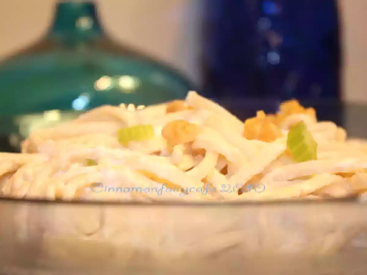 Linguine alla salsa di ricotta, noci e sedano vota adesso Portata principalefacile35 min Invia questa ricetta ad un amico Stampa la ricetta Contatta l'autore della Ricetta Pubblica la foto di questa ricetta Ingredienti 2 200 g linguine 200 g ricotta 10 noci sgusciate 1 gambo di sedano Sale, qb Latte, mezzo bicchiere Parmigiano, qb