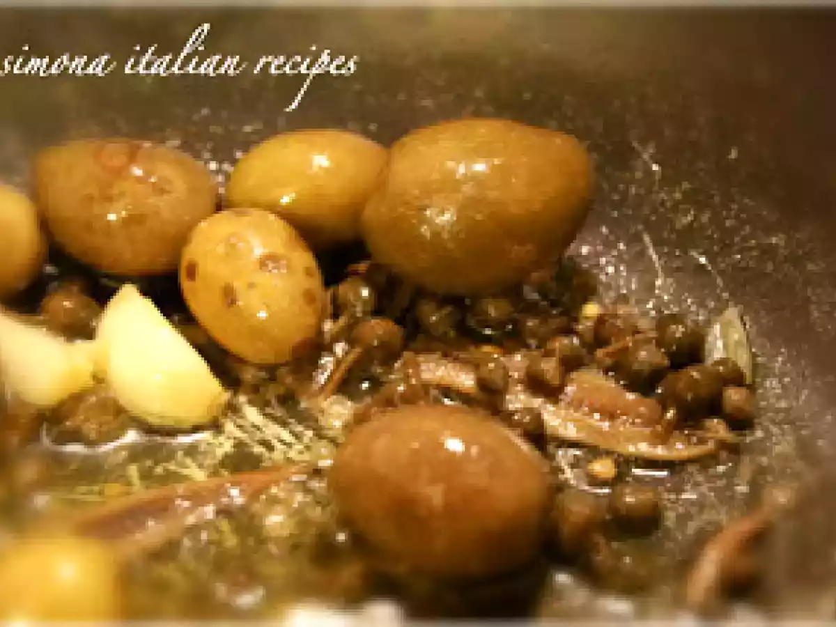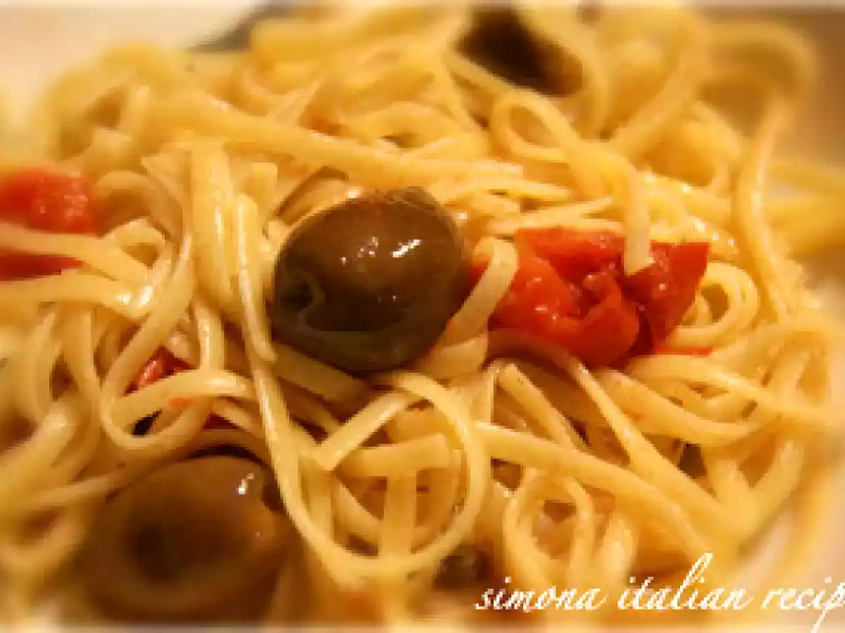 Linguine alla stromboliana (primi,sicilia) vota adesso PrecedenteProssimo Portata principalefacile35 min Invia questa ricetta ad un amico Stampa la ricetta Contatta l'autore della Ricetta Pubblica la foto di questa ricetta Ingredienti 4 400 g linguine 8-10 olive verdi intere in salamoia di finocchietto-aglio-peperoncino 5 filetti di acciuga sotto sale 2 spicchi di aglio 2 cucchiai colmi di capperi sotto sale dissalati delle eolie ½ bicchiere di Malvasia delle Eolie oppure meno di ½ bicch di Zibibbo 2 peperoncini piccanti freschi 2 o 3 pomodorini a scocca oppure pomodori perini tagliati a fette rotonde Olio,sale