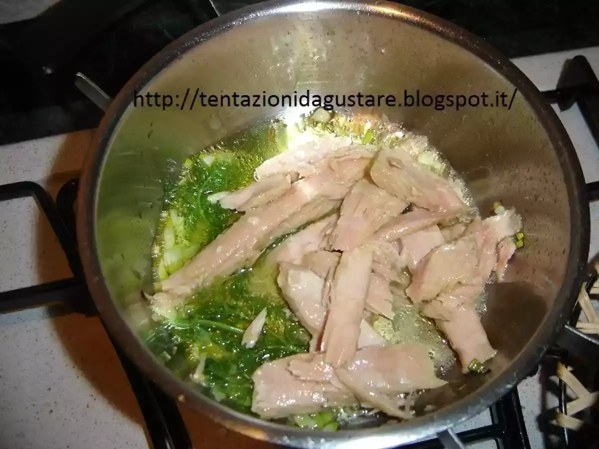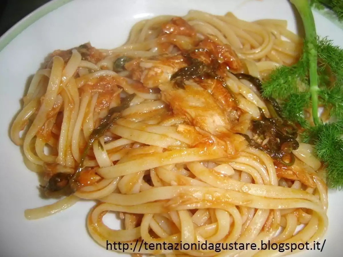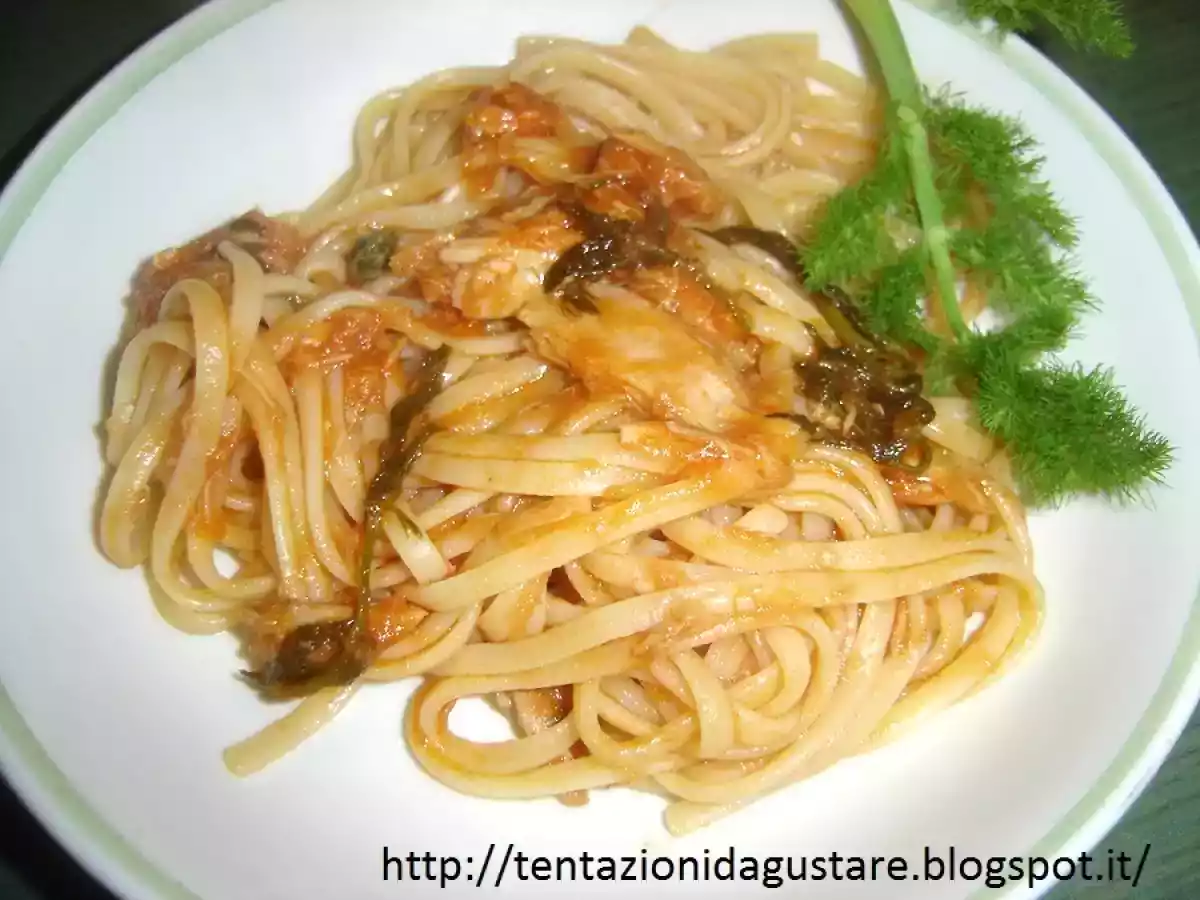 Linguine alla ventresca di tonno PrecedenteProssimo Portata principalemedia35 min Invia questa ricetta ad un amico Stampa la ricetta Contatta l'autore della Ricetta Pubblica la foto di questa ricetta Ingredienti 4 400 gr. di linguine 230gr di Ventresca di Tonno Mareblu 1 cipollina tenera 100 gr di pinoli 50 gr di capperi sotto sale 1 bicchiere di passato di pomodoro finocchetto selvatico Peperoncino contuso Tec-Al Olio extra vergine d'oliva sale q.b