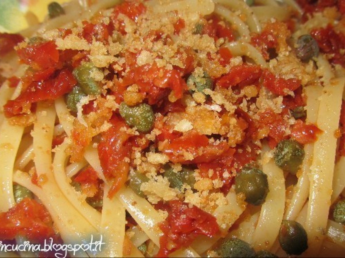 Linguine con pomodori secchi e capperi PrecedenteProssimo Portata principalefacile20 min365 Kcal Invia questa ricetta ad un amico Stampa la ricetta Contatta l'autore della Ricetta Pubblica la foto di questa ricetta un primo saporito e abbastanza light Ingredienti 3 200 gr.di linguine 10-12 pomodori secchi una manciata di capperi aglio olio pane grattugiato Costo stimato: 2.83Euros€ (0.94€/Porzioni)