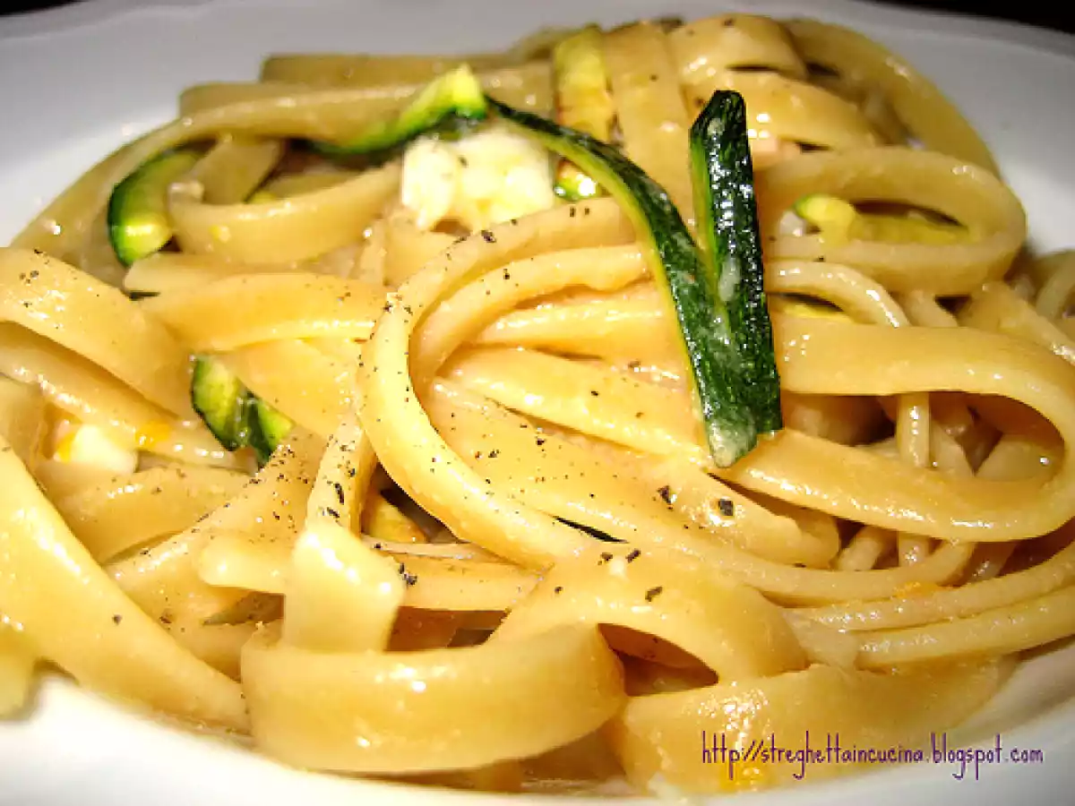 Linguine con zucchine e scampi marinati all'arancia