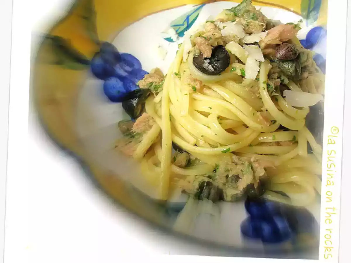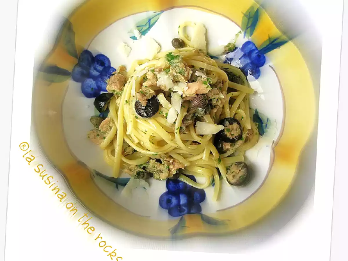 Linguine tonno, capperi, olive con scaglie di pecorino romano d.o.p. vota adesso PrecedenteProssimo Portata principalefacile30 min342 Kcal Invia questa ricetta ad un amico Stampa la ricetta Contatta l'autore della Ricetta Pubblica la foto di questa ricetta Ingredienti 4 linguine 200 g di tonno sott'olio 1 spicchio d'aglio 150 g di olive nere denocciolate 50 g di capperi salati prezzemolo olio/sale/pepe pecorino romano DOP