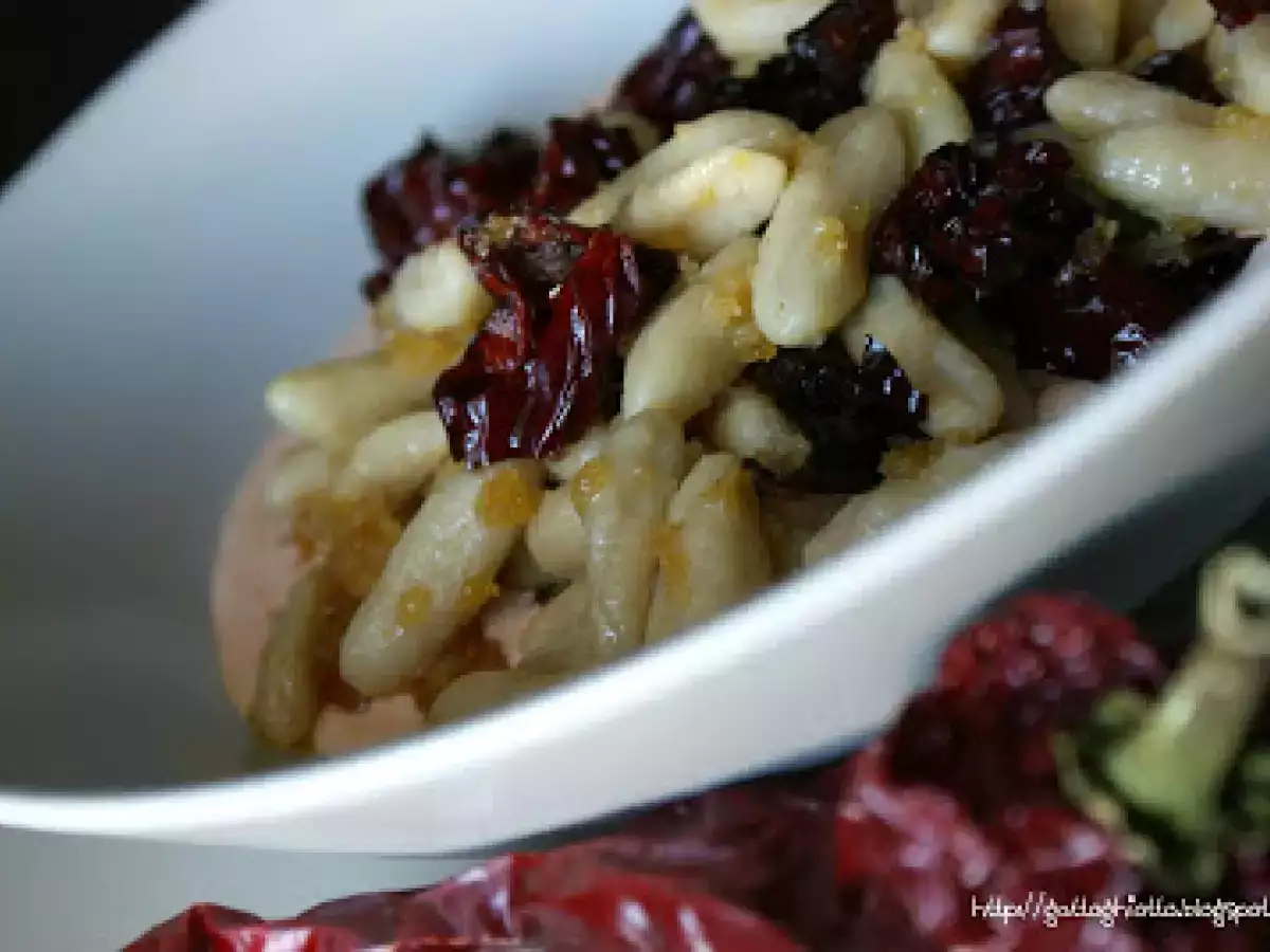 Lucana per caso...cavatelli ai peperoni cruschi su crema di pecorino lucano PrecedenteProssimo Portata principalefacile1 ora848 Kcal Invia questa ricetta ad un amico Stampa la ricetta Contatta l'autore della Ricetta Pubblica la foto di questa ricetta Ingredienti 4 Per la pasta: 400 g di farina di grano duro Acqua tiepida Sale Per il condimento: 6 Peperoni secchi 1 Spicchio d'aglio 2 pugni di mollica di Pane di grano duro Olio extravergine d'oliva Peperoncino piccante a scaglie Pecorino lucano grattugiato Sale Per la salsa: 200 ml di panna liquida 4 cucchiai di Pecorino lucano grattugiato 3 cucchiaini di Polvere di peperone dolce Costo stimato: 6.2Euros€ (1.55€/Porzioni)