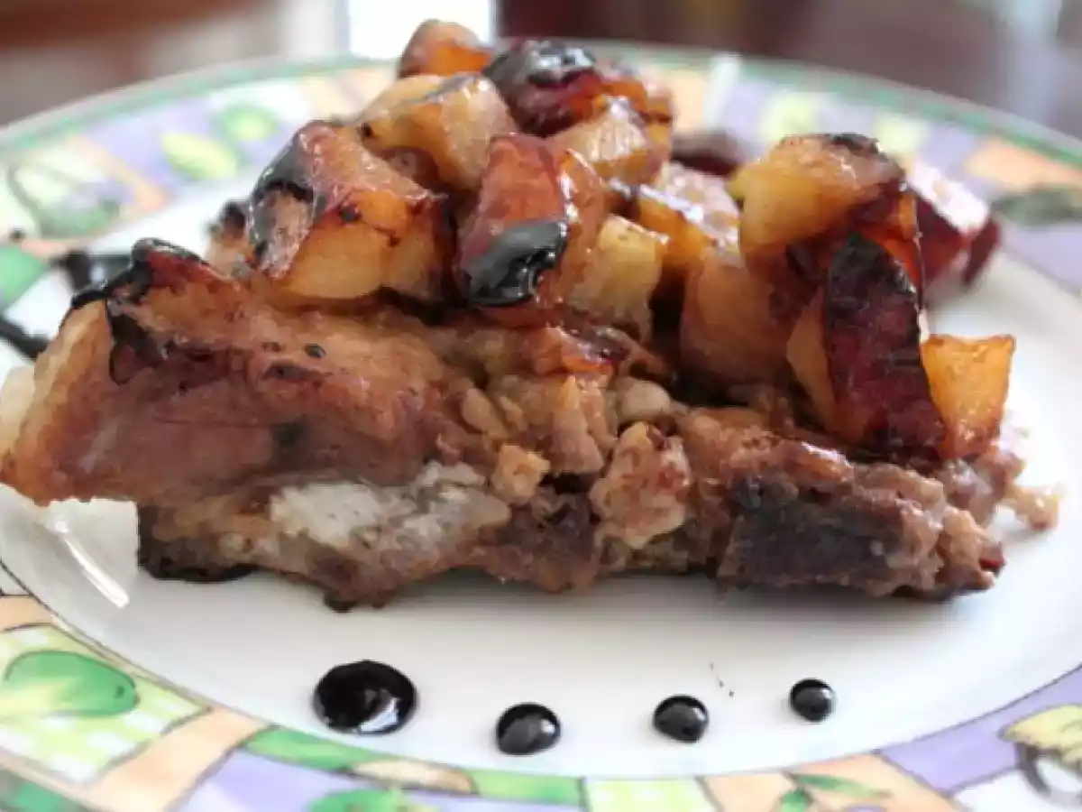 Maiale agrodolce con contorno di mele PrecedenteProssimo Portata principalefacile31 min Invia questa ricetta ad un amico Stampa la ricetta Contatta l'autore della Ricetta Pubblica la foto di questa ricetta Ingredienti 1 1 bistecca di maiale 1 mela 1 spicchio d’aglio olio extravergine d’oliva e sale q.b. 1/2 bicchierino da caffè di aceto balsamico 1 cucchiaino di miele 3/4 di bicchierino di brandy farina q.b.