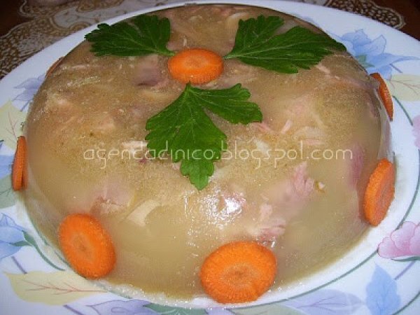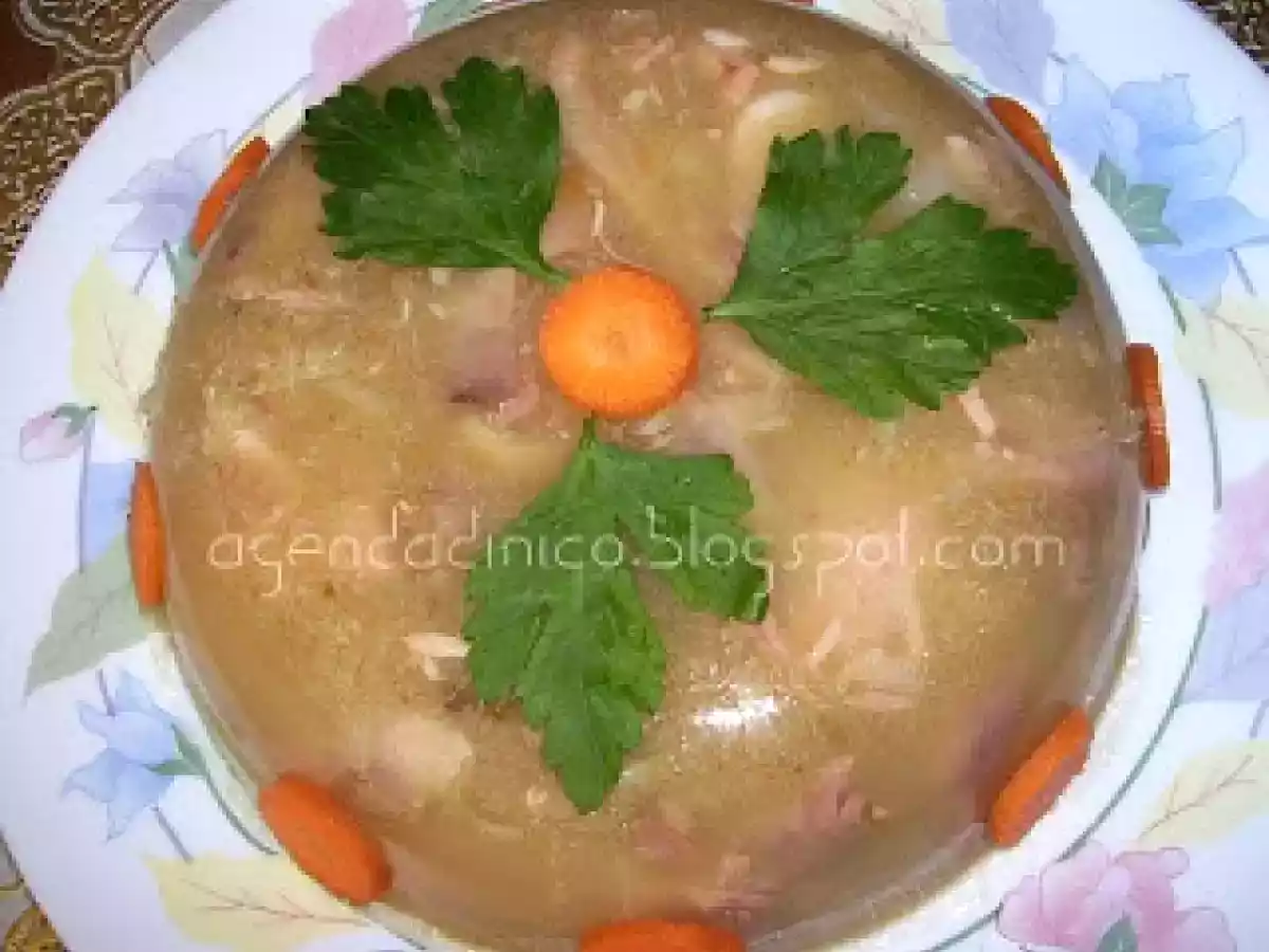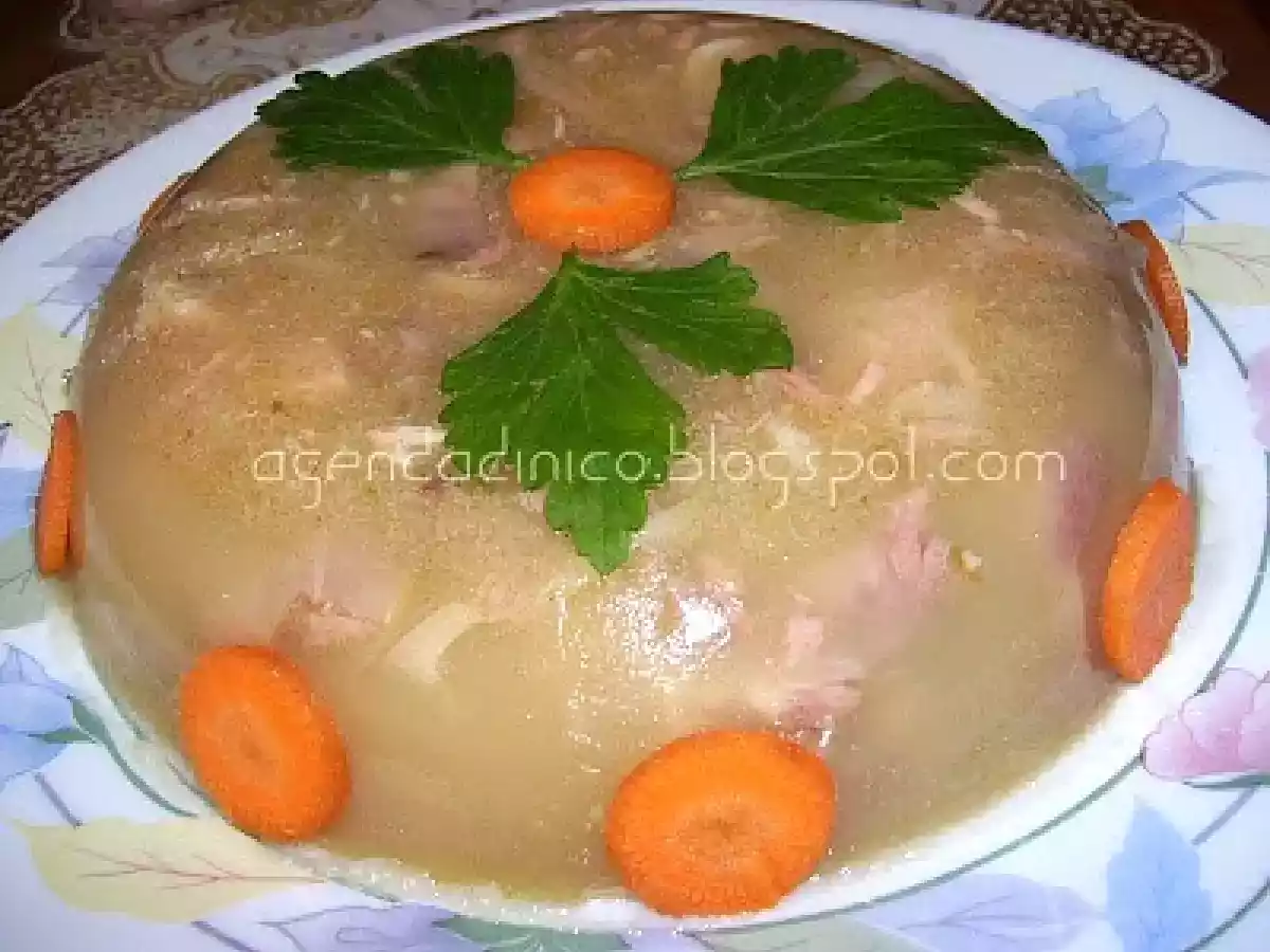 Maiale in gelatina / piftie de porc PrecedenteProssimo Portata principalefacile1 ora Invia questa ricetta ad un amico Stampa la ricetta Contatta l'autore della Ricetta Pubblica la foto di questa ricetta Ingredienti 6 2 piedi di maiale orecchie, testa di maiale, coda un pezzo di carne di maiale circa 200 g 2 coste di sedano 2 carote 1 cipolla 3 spicchio d' aglio 1 cucchiaino di pepe in grani sale