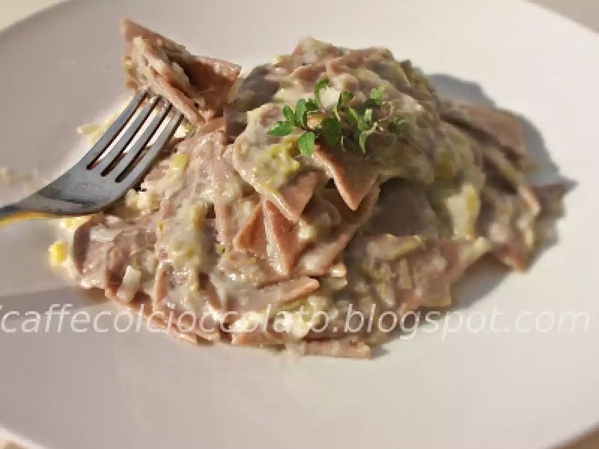 Maltagliati di farina di castagne con salsa di porri vota adesso Portata principalefacile50 min Invia questa ricetta ad un amico Stampa la ricetta Contatta l'autore della Ricetta Pubblica la foto di questa ricetta Ingredienti 2 per la pasta: 200 grammi di farina di semola di grano duro 200 grammi di farina di castagne 2 uova acqua q.b. per il condimento: qualche cucchiaio di besciamella morbida 2 porri medi mezzo bicchiere di vino bianco 2 - 3 cucchiai di parmigiano qualche fogliolina di maggiorana per rifinire