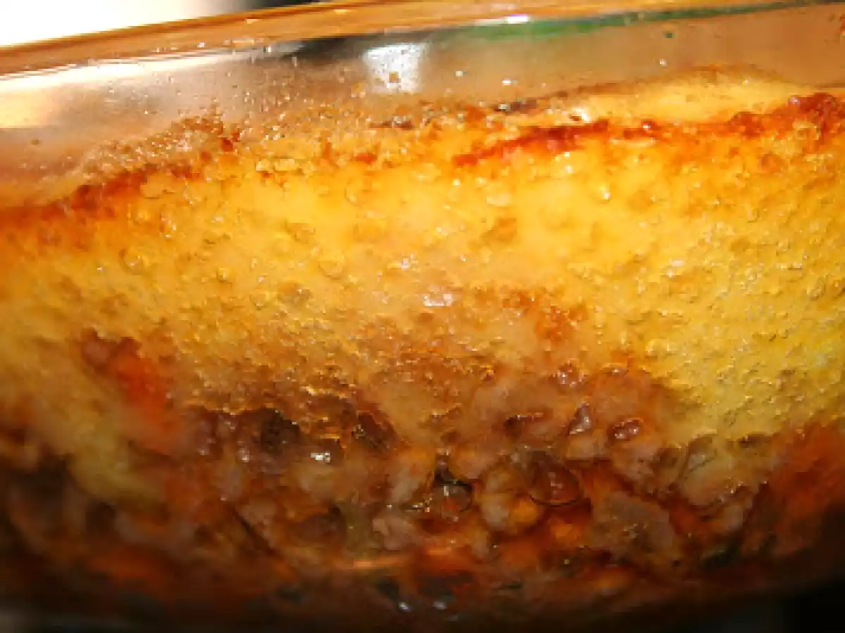 - Adesso in una pirofila stendere in uno strato la carne con tutti i succhi magari eliminando la foglia di alloro, coprire con il purè di patate, livellare e cospargere di fiocchetti di burro infornare naturalmente in forno già caldo a 200° per 15 minuti, o fino a gratinatura