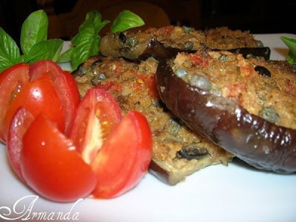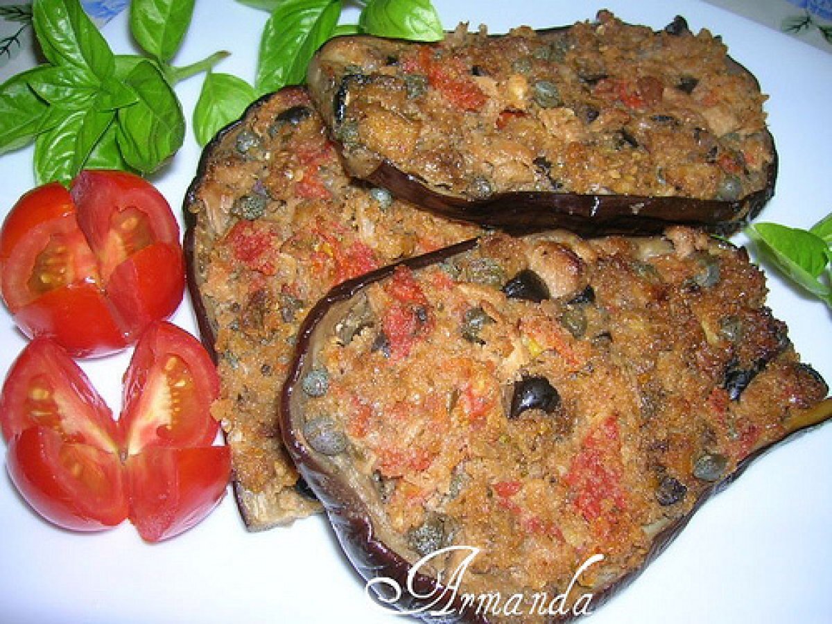Melanzane ripiene alla mediterranea PrecedenteProssimo Portata principalefacile1 h 40 m Invia questa ricetta ad un amico Stampa la ricetta Contatta l'autore della Ricetta Pubblica la foto di questa ricetta Un piatto pieno di sapore e gioia per una ricetta semplice! Una vera delizia! Ingredienti 3 3 melanzane lunghe 100 g di tonno 100 g di olive nere denocciolate 60 g di capperi 6 acciughe 2 fette di pane un pò di parmigiano e romano 750 g di pomodori maturi aglio, cipolla tropea un pò di prezzemolo sale e pepe q.b. olio E.V.O. q.b. olio di arachide per friggere q.b.