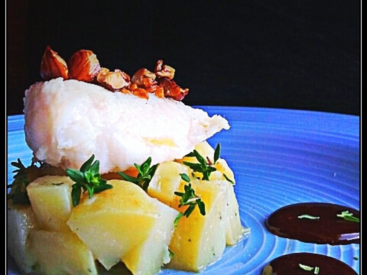 Merluzzo al vapore su patate al timo e riduzione di goji