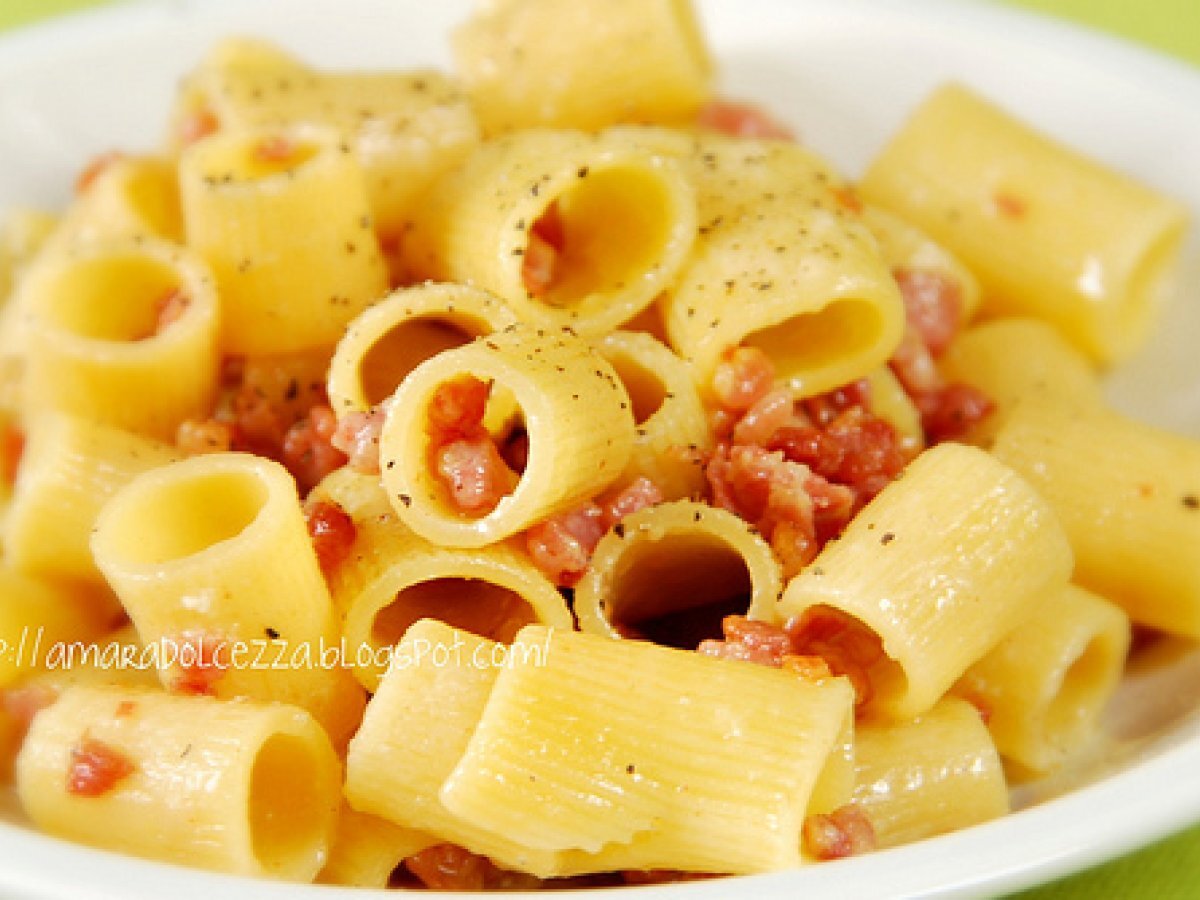 - Cuocere le mezze maniche al dente, senza salarli troppo, scolarli, metterle nella padella con il condimento e mantecarli con pecorino e un mestolo dell?acqua di cottura.