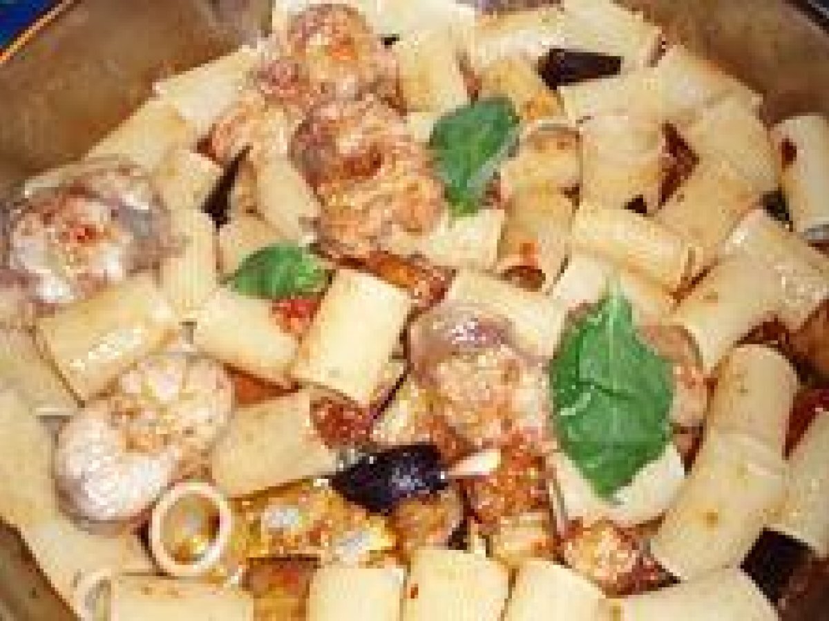 Il pesche se fresco non ha bisogno di aromi importanti come l'arancio e l'erba cipollina avrei optato per dei pomodorini tagliuzzati tirati con olio d'oliva e cipolla per qualche minuto in sieme ai dadini dirana per poi condire insieme alle mezze maniche.