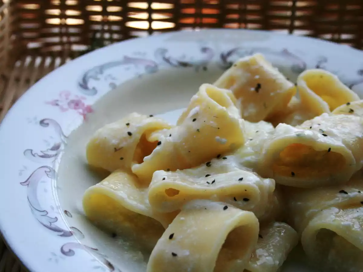 Mezzi paccheri alla crema di patate, ricotta e semi di anice di montagna