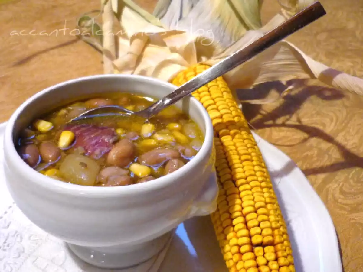 - Far bollire a fiamma bassa per c.ca 40 minuti il granoturco, i fagioli, le patate, il pomodoro ed il prosciutto. Fare a parte un soffritto con aglio, cipolla, sedano e lardo tagliato a listarelle, far bollire ancora fino ad ottenere una buona densità.