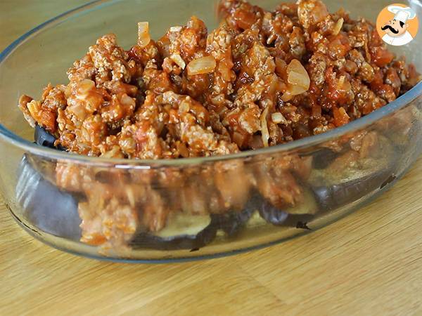 Adesso prendete un piatto da forno e spennellatelo con l'olio di oliva. Adagiate sul fondo metà delle vostre melanzane e aggiungete in seguito la carne; quindi livellate.