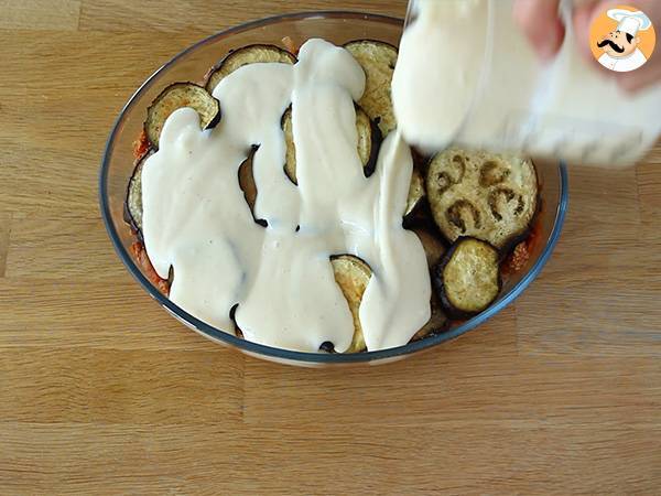 Ricoprite la superficie con le melanzane che restano ed infine versate sulla moussaka la salsa bianca.