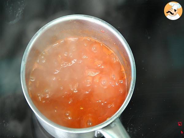 Mettete l'olio in una pentola, aggiungete i pomodori senza pelle e tagliati a dadini. Ora aggiungete il sale, il pepe, 1/2 cucchiaino di cannella e il concentrato di pomodoro. o Mescolate e lasciate ridurre la preparazione per 15 minuti a fuoco lento.