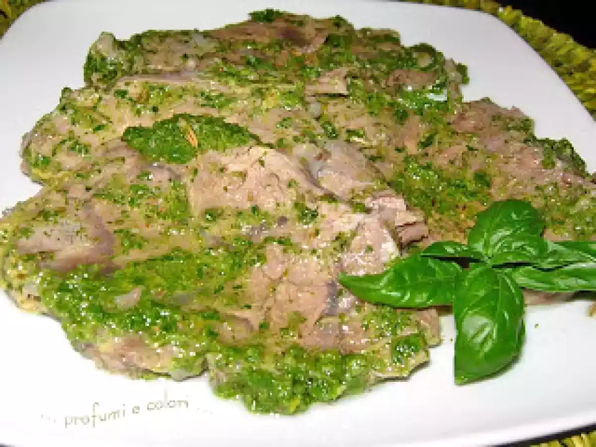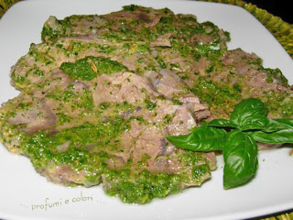 - Emulsionare l'aceto con la senape, poi aggiungere i capperi e gli aromi tritati e mescolare, regolare con sale e pepe, aggiungere poi l'olio ed eventualmente un cucchiaio di brodo.