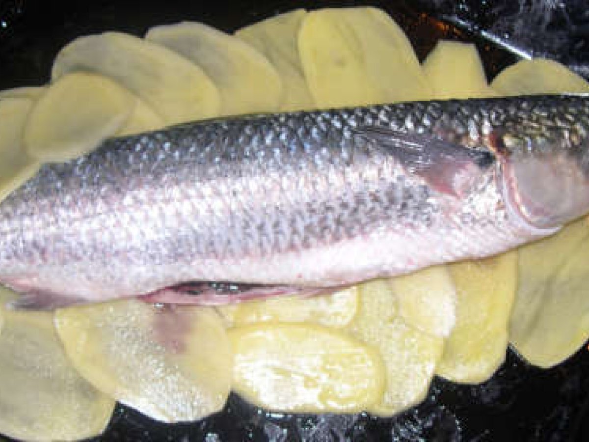 Orata (branzino) in crosta di patate PrecedenteProssimo Portata principalemedia45 min Invia questa ricetta ad un amico Stampa la ricetta Contatta l'autore della Ricetta Pubblica la foto di questa ricetta Ingredienti 3 Per questa ricetta potete usare orata, branzino o altri pesci azzurri di media grandezza. L'orata rimane la più addatta perchè piatta e facile da coprire con le fettine di patate. 1 orata fresca da 800 gr -1 kg 4-5 patate rametti di rosmarino olio extravergine sale, pepe