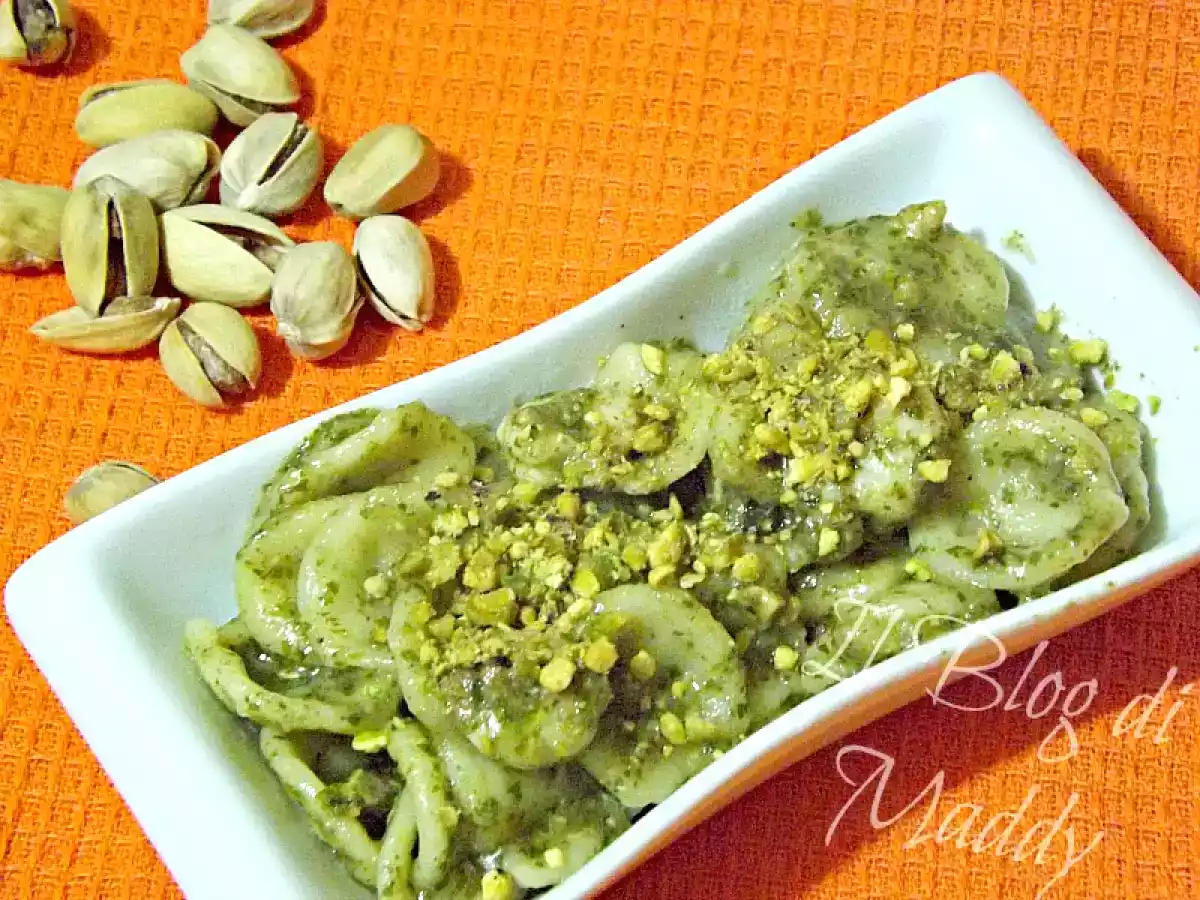 Per prima cosa preparate il pesto (si può preparare con il classico mortaio, ma ci vuole molto tempo, oppure la soluzione più veloce è quella di usare un frullatore, come ho fatto io): mettete in un frullatore le foglie di basilico ben lavate e asciugate, aggiungete i pistacchi, uno spicchio di aglio, il sale, il formaggio pecorino e il parmigiano, tritate un po’ ed aggiungete a filo l’olio, finchè non otterrete un trito omogeneo ed abbastanza fine, quindi mettetelo da parte; fatto questo sgusciate i gamberi.