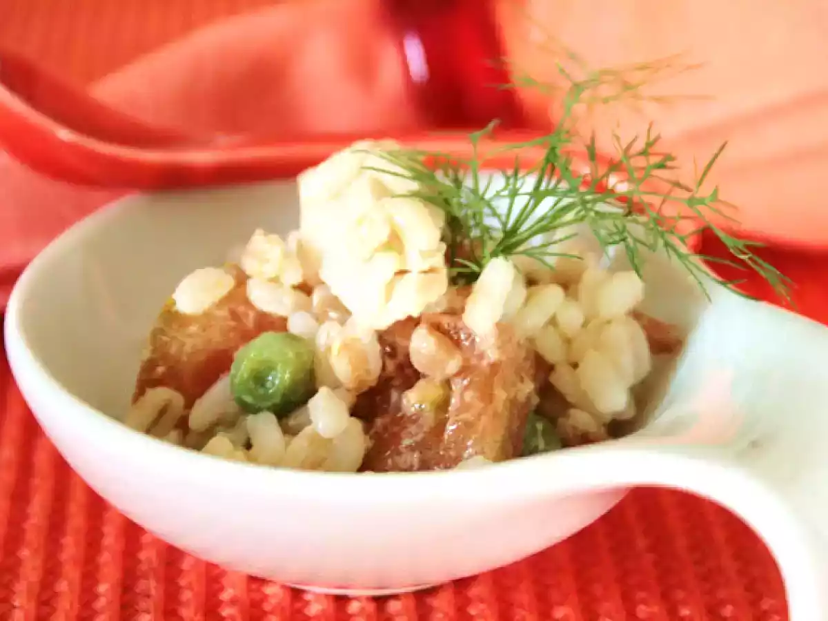 Orzo,farro o riso?...tutti!!! Portata principalefacile2 h 20 m Invia questa ricetta ad un amico Stampa la ricetta Contatta l'autore della Ricetta Pubblica la foto di questa ricetta Ingredienti 2 150 g di cereali misti riso-farro-orzo 1 fetta di pollo di circa 200 g lessata e tagliata a striscioline 100 g di piselli lessati in acqua salata 1 pomodoro maturo tagliato a cubetti e condito con olio e sale 100 g di formaggio dolce tipo emmentaler a cubetti 1 cucchiaio di maionese un ciuffo di aneto