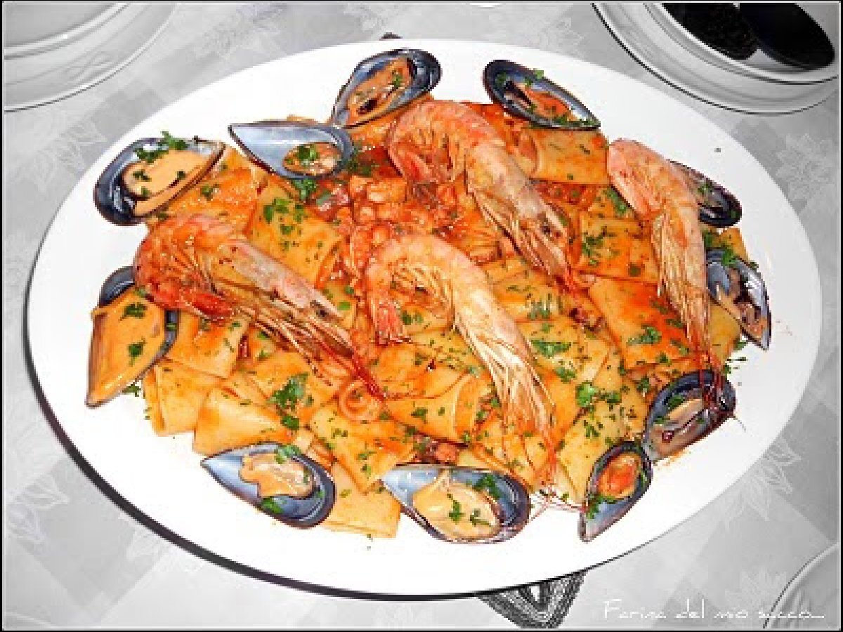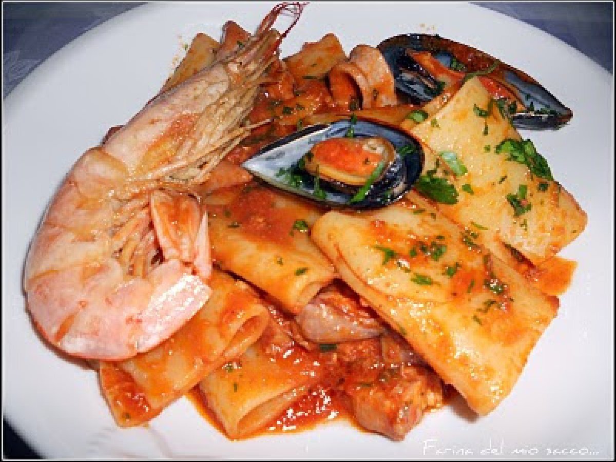 Paccheri allo scoglio PrecedenteProssimo Portata principalefacile55 min Invia questa ricetta ad un amico Stampa la ricetta Contatta l'autore della Ricetta Pubblica la foto di questa ricetta Ingredienti 4 500 grammi di paccheri di gragnano 300 grammi di calamaretti 200 grammi di moscardini 200 grammi di pesce spada 200 grammi di mazzancolle 5/6 gamberoni 10 cozze 500 ml di passata di pomodoro verace uno spicchio di aglio prezzemolo tritato olio extravergine di oliva sale e pepe q.b.