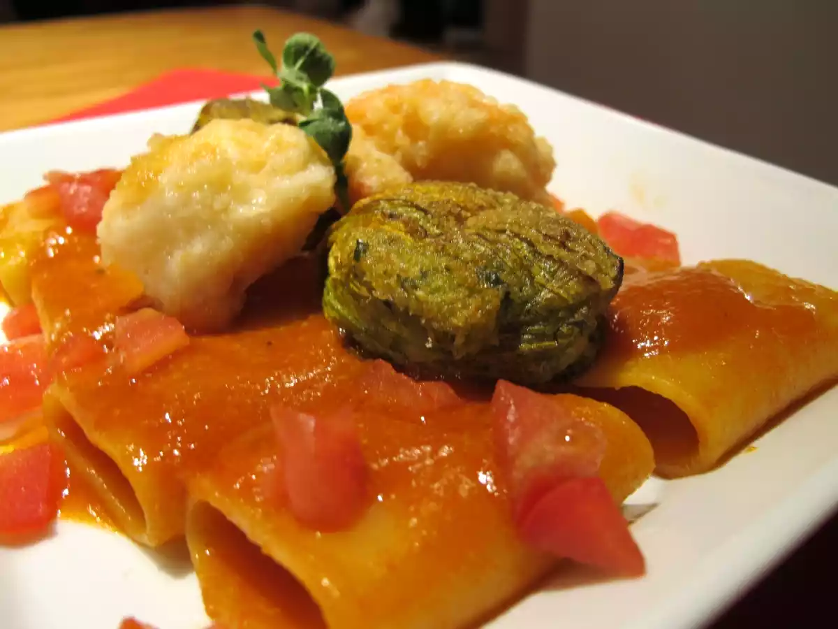 Paccheri con bisque al peperone, scampi fritti e fiori di zucca ripieni al baccalà Portata principaleDifficile3 h 30 m Invia questa ricetta ad un amico Stampa la ricetta Contatta l'autore della Ricetta Pubblica la foto di questa ricetta Ingredienti 4 280 g di paccheri 1/2 peperoni rossi (secondo dimensione) 600 g di scampi di pezzatura medio/grande, sgusciati (peso ante sgusciatura) Teste e carapaci degli scampi 1 sedano 1 carota 2/3 scalogni 2 pomodori privati della pelle e dei semi 1 bicchiere di vino bianco 150 g di baccalà, lessato, spellato e spinato 1 piccola patata, lessata e sbucciata 8 zucchinette con il fiore Pangrattato Basilico Semola di grano duro (per infarinare le code di scampo) Aglio Timo Concassé di pomodoro per guarnire Olio evo, sale