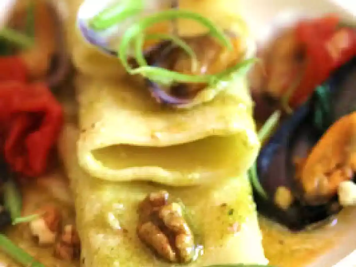 Paccheri con cozze, vongole e pesto di sedano e noci PrecedenteProssimo Portata principalefacile50 min Invia questa ricetta ad un amico Stampa la ricetta Contatta l'autore della Ricetta Pubblica la foto di questa ricetta Ingredienti 4 Paccheri Vongole Cozze Noci Pomodorini Sedano Pesto Sedano Noci Olio Evo Aglio Peperoncino in polvere Sale