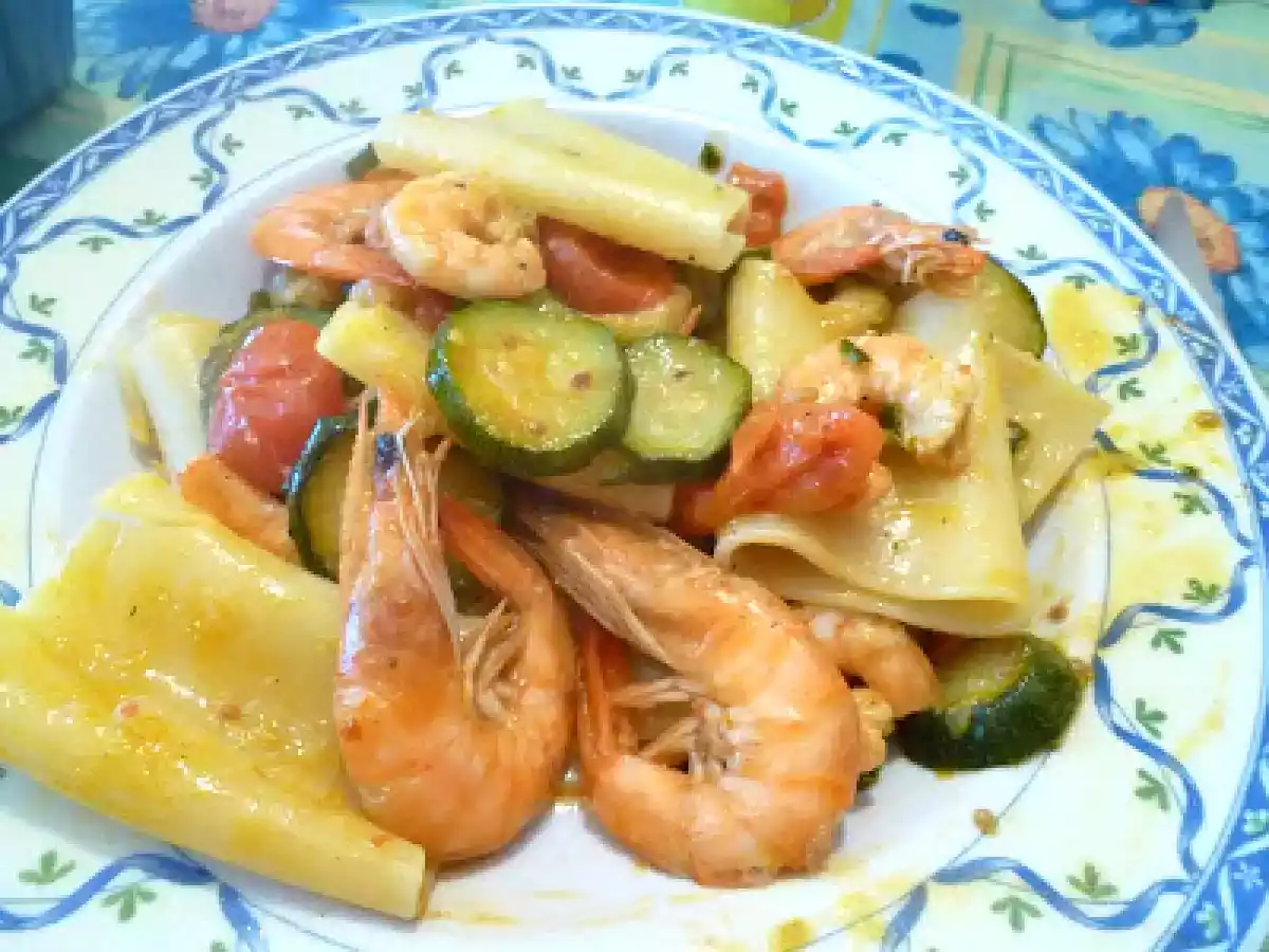Paccheri con mazzancolle, zucchine e pomodorini