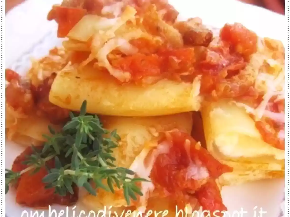 Paccheri gratinati alla pancetta ripieni al tomino PrecedenteProssimo Portata principalemedia40 min Invia questa ricetta ad un amico Stampa la ricetta Contatta l'autore della Ricetta Pubblica la foto di questa ricetta paccheri gratinati ripieni Ingredienti 2 80 gr di paccheri 10-12 pomodorini 4 fette di bacon 1 fetta di pancetta 1 piccola cipolla 2-3 cucchiai di salsa al pomodoro 1 tomino 100 gr di ricotta timo parmigiano sale, peperoncino