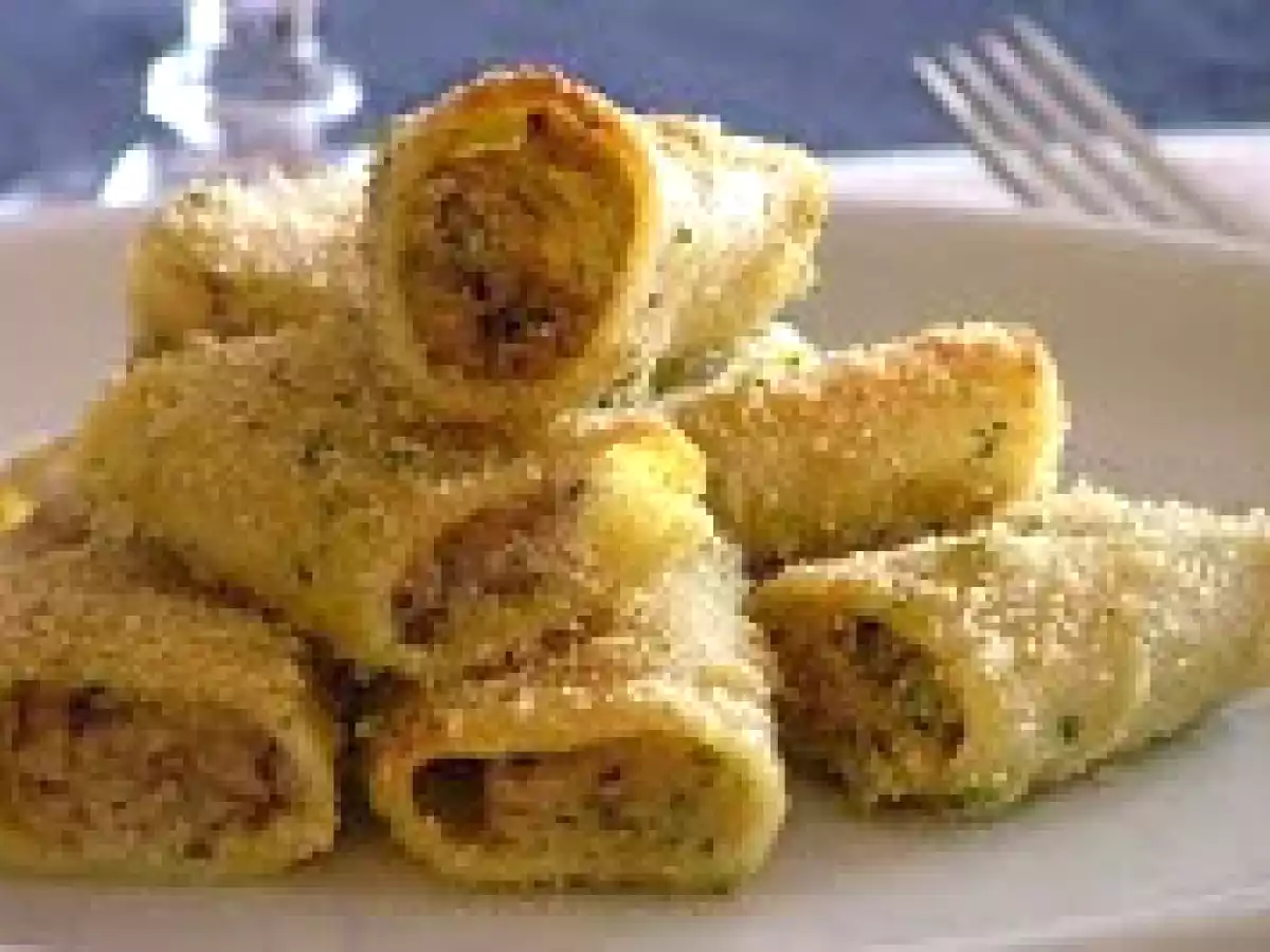 Paccheri ripieni al tonno Portata principalefacile45 min Invia questa ricetta ad un amico Stampa la ricetta Contatta l'autore della Ricetta Pubblica la foto di questa ricetta Ingredienti 4 200 g di tonno sott'olio 12 olive nere 2 filetti di alice sott'olio 4 cucchiai d'olio extravergine di oliva 250 ml di brodo vegetale una manciata di origano timo 250 g di pasta tipo paccheri 3-4 rametti di prezzemolo 1 spicchio d'aglio 1 cucchiaio di pangrattato sale q.b. pepe q.b.