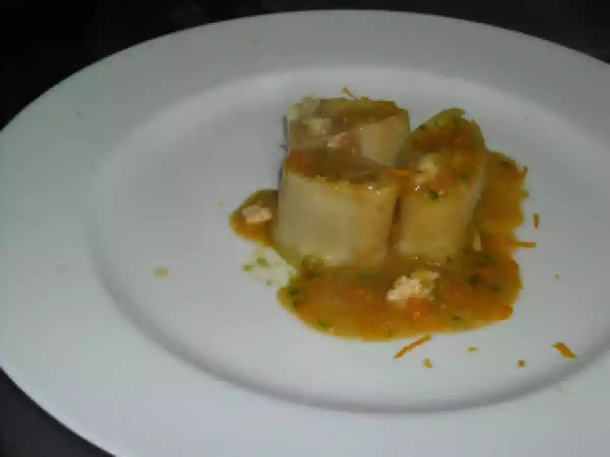 Paccheri ripieni di zucchine alle noci con sugo di scampi all'arancia vota adesso Portata principalefacile35 min Invia questa ricetta ad un amico Stampa la ricetta Contatta l'autore della Ricetta Pubblica la foto di questa ricetta Ingredienti 4 200 g di paccheri oppure 4/5 paccheri a testa 400 g di zucchine 150 g di noci sgusciate una cipolla aromi misti sedano carota 600 g di scampetti freschi 2 arance olio evo sale pepe