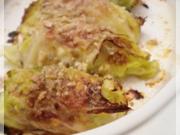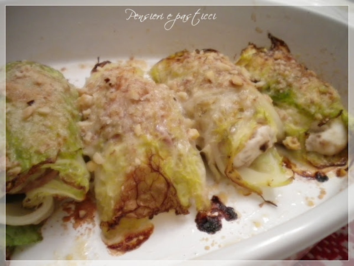 Pacchettini di verza ripieni di crudo, ricotta e noci vota adesso PrecedenteProssimo Portata principalefacile45 min Invia questa ricetta ad un amico Stampa la ricetta Contatta l'autore della Ricetta Pubblica la foto di questa ricetta Ingredienti 4 Foglie di verza belle grosse e tenere, per noi, che siamo in tre, 2 a testa 50 g gherigli di noci 150 g ricotta 5-6 fette di prosciutto crudo un pò di parmigiano grattugiato olio d'oliva sale e pepe