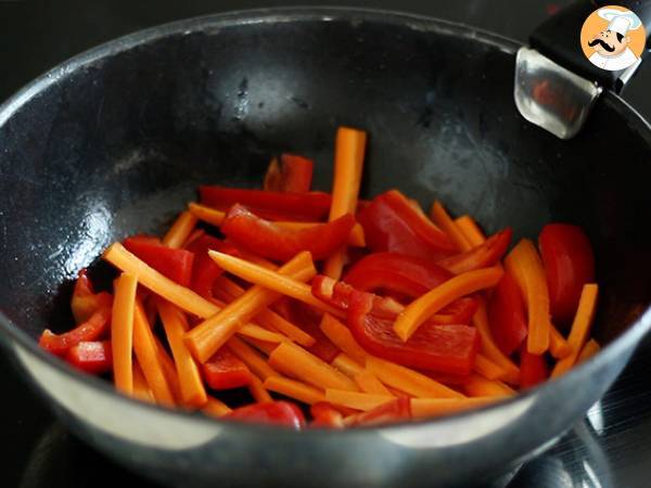 Adesso mettete da parte il tofu e conservate l'olio in padella. Sempre nello stesso olio, quindi, aggiungete i peperoni tagliati a lamelle, le carote a bastoncini e saltate per 3 minuti.